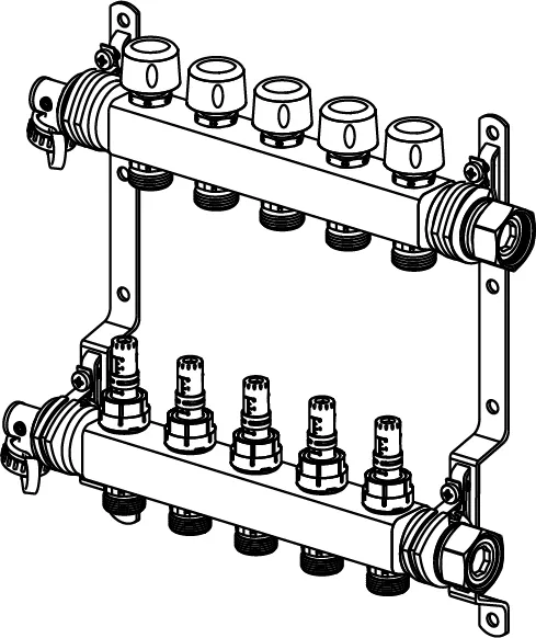 - Per raffrescamento e riscaldamento a pavimento- Applicabile con attuatori 1141676 (230 V) e 1141677 (24 V)- Pressione massima: 6 bar a 60 °C