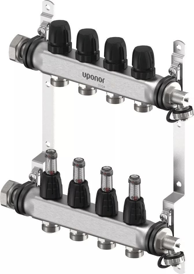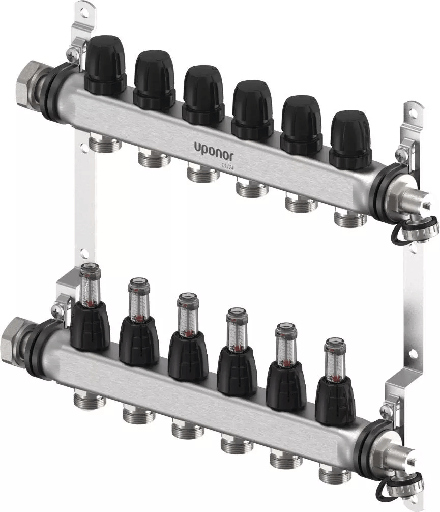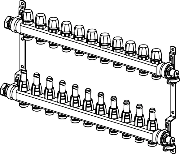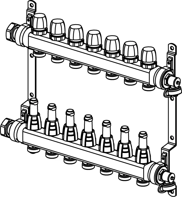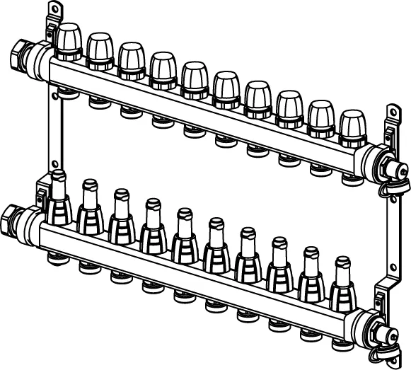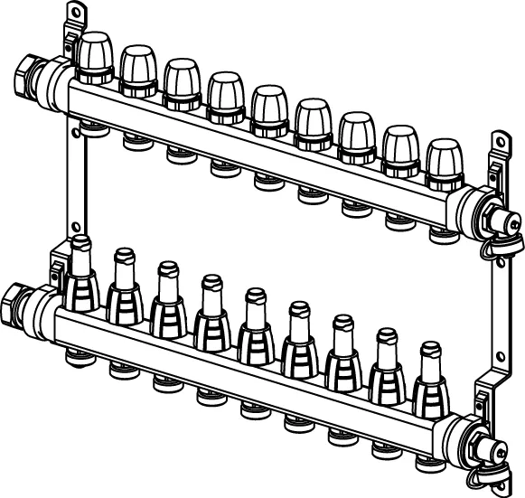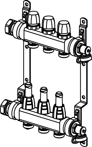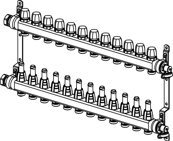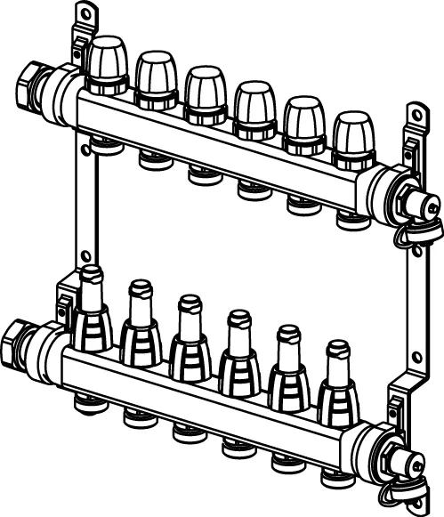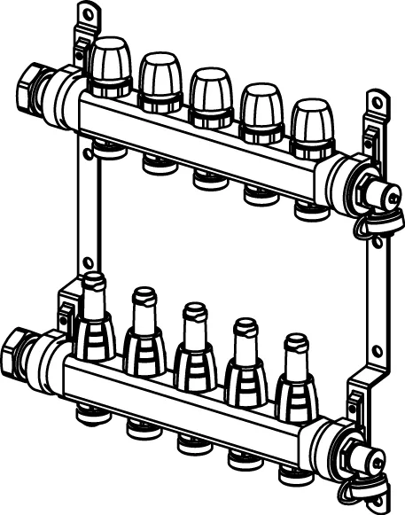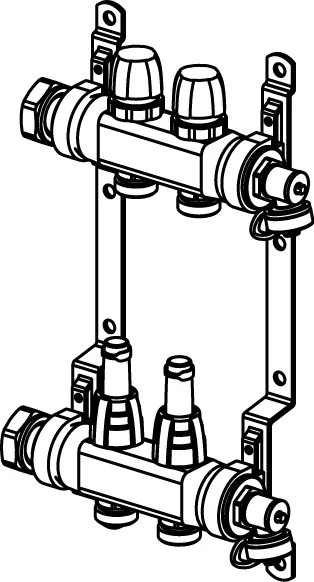 - Per raffrescamento e riscaldamento a pavimento- Applicabile con attuatori 1141676 (230 V) e 1141677 (24 V)- Pressione massima: 6 bar a 60 °C