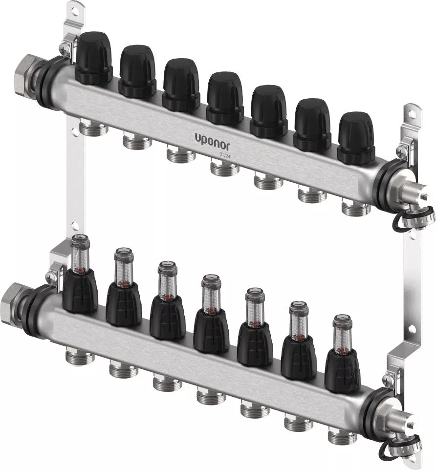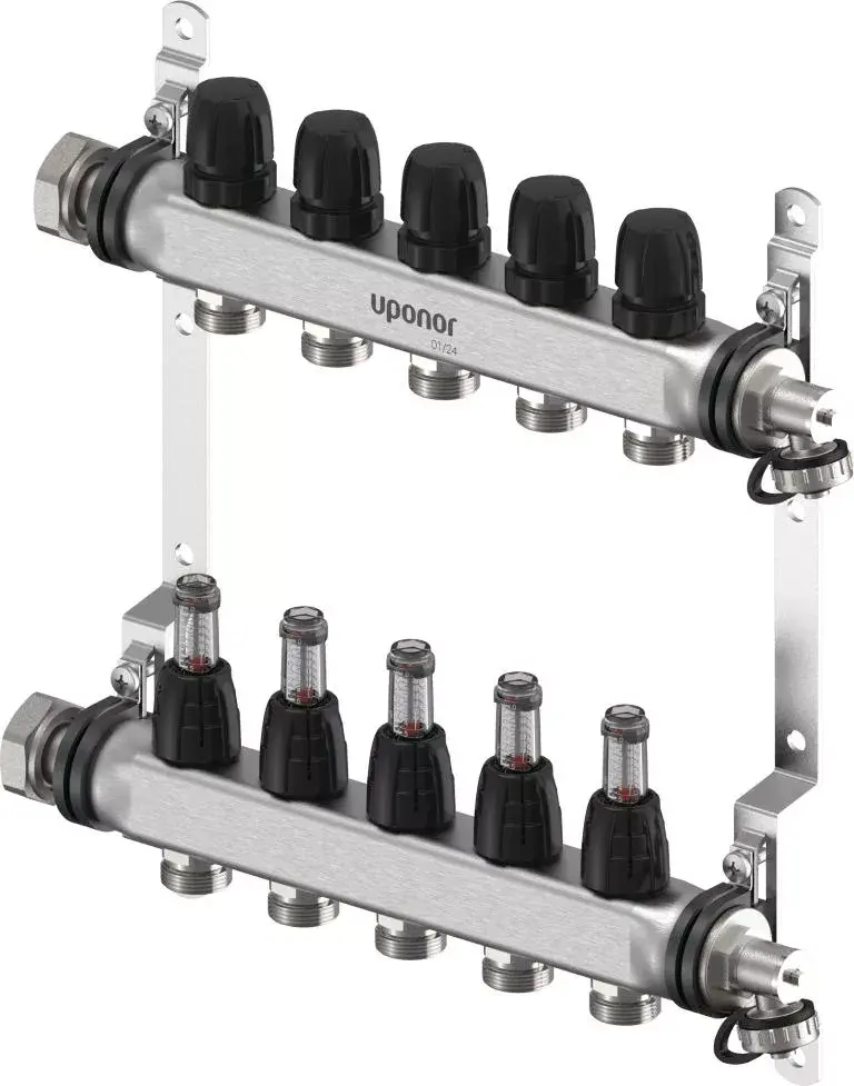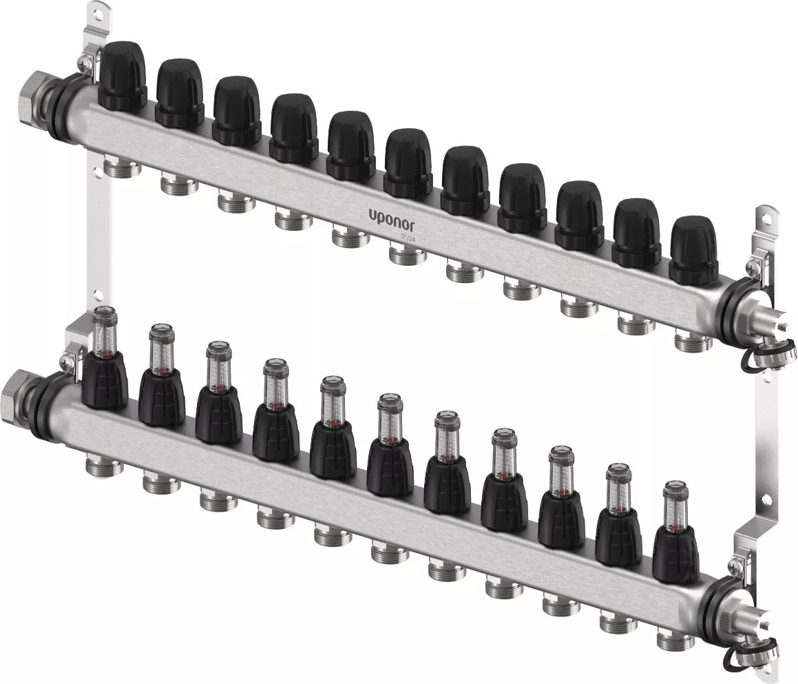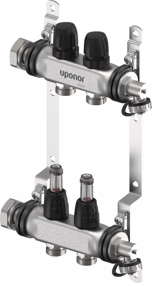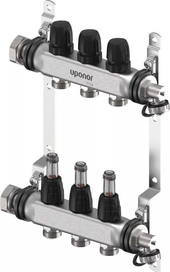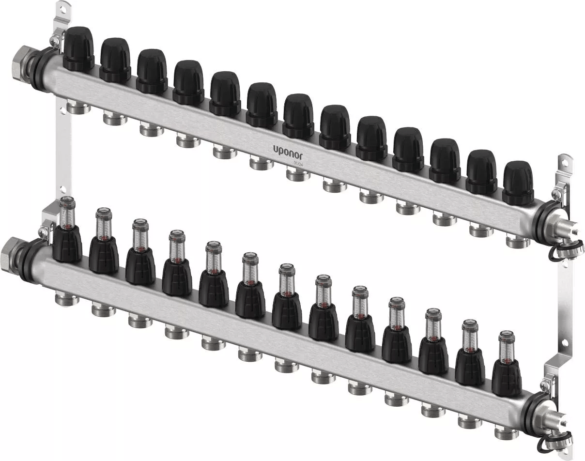 - Per raffrescamento e riscaldamento a pavimento- Applicabile con attuatori 1141676 (230 V) e 1141677 (24 V)- Pressione massima: 6 bar a 60 °C
