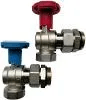 Coppia di valvole a sfera a 90° 1''Fx1''M con leva rossa/blu e termometro 0-120°C. Dimensioni: 101x94x60mm.