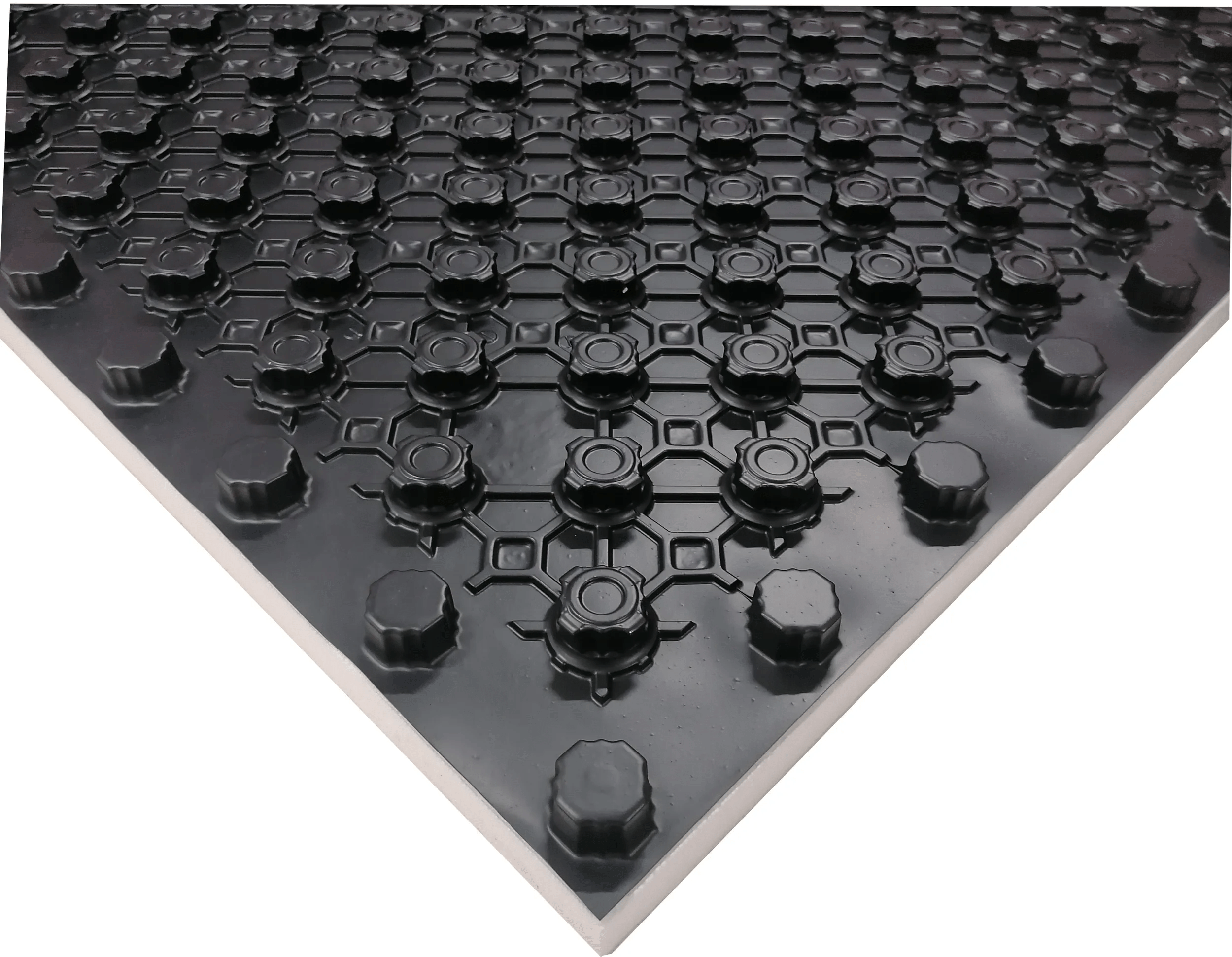 - pannello preformato, composto da un foglio in PS antiurto rigido nero opaco dello spessore di 600 micron, stampato sottovuoto- isolante in EPS ad elevatissima resistenza alla deformazione da calpestio- disponibili nelle versioni da 10-20-30-40-50-60 mm di spessore effettivo- la sagomatura delle bugne permette una posa agevole della tubazione a maglia ortogonale- posa semplice e veloce dei pannelli attraverso l’incastro maschio – femmina del foglio protettivo superiore- reazione al fuoco: euroclasse E secondo EN 13501-1 (EPS)- esente da HCFC, riciclabile- modulo di posa pari a 50 mm e lunghezza totale pannello pari a1450 mm- larghezza totale pannello: 850 mm- spessore totale del pannello (comprensivo di bugne): 32-42-52-62-72-82 mm- resistenza termica isolamento (senza bugne): 0,30-0,59-0,88-1,18-1,47-1,76 m2K/W- resistenza a compressione (def.10 %): 200 kPa (10mm) e 150 kPa (da 20 mm a 60 mm) ai sensi della norma EN 826- conformità CE* su richiesta