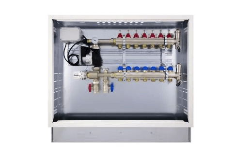 Unità di miscelazione preassemblata KLIMAEASY che mantiene costante la temperatura dell'acqua sul collettore. L'unità di miscelazione KLIMAEASY è dotata di: - valvola di miscelazione a 3 vie - attuatore elettrotermico con sensore incorporato - pompa di circolazione a velocità variabile conforme a ERP 2015 - termostato di sicurezza - raccordi girevoli da 1" - 1 valvola a sfera di intercettazione - termometro sul circuito di alimentazione - termometro sul circuito di ritorno - collettore in ottone da 1" con controllo termostatico - sfiato aria automatico - valvola di riempimento/scarico - armadio espandibile