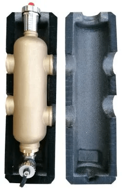 Separatore idraulico dotato di collegamenti F1", manometro, termostato di mandata/ritorno, sfiato dell'aria automatico, valvola di scarico, isolamento in polietilene estruso