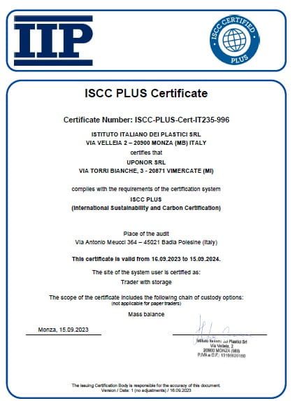 Dichiarazione ambientale di prodotto (EPD) – Combi Pipe Blue in guaina • La nuova tubazione Uponor Combi Pipe Blue in guaina è trattato in conformità ai nuovi requisiti igienici delle liste positive per i materiali organici. La materia prima PE rinnovabile per il tubo è prodotta utilizzando materie prime rinnovabili di provenienza sostenibile.