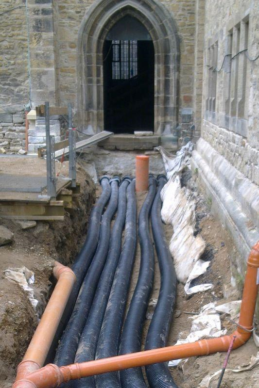 After technicians removed the layers of floor covering in the nave and the crypt, the natural stone beams of the foundation were revealed. Technicians drilled core holes in the stone beams and installed the flexible, pre-insulated pipes of the Ecoflex Thermo Twin system. The front of pipes were inserted into the holes and pulled through using conveyor belts. The pipes were then fed in from the back. Enrico Soeder from our Technical Sales department instructed the technicians at Klaus Jentzsch GmbH in Sarstedt in the handling of pipes, fittings and the installation system itself.