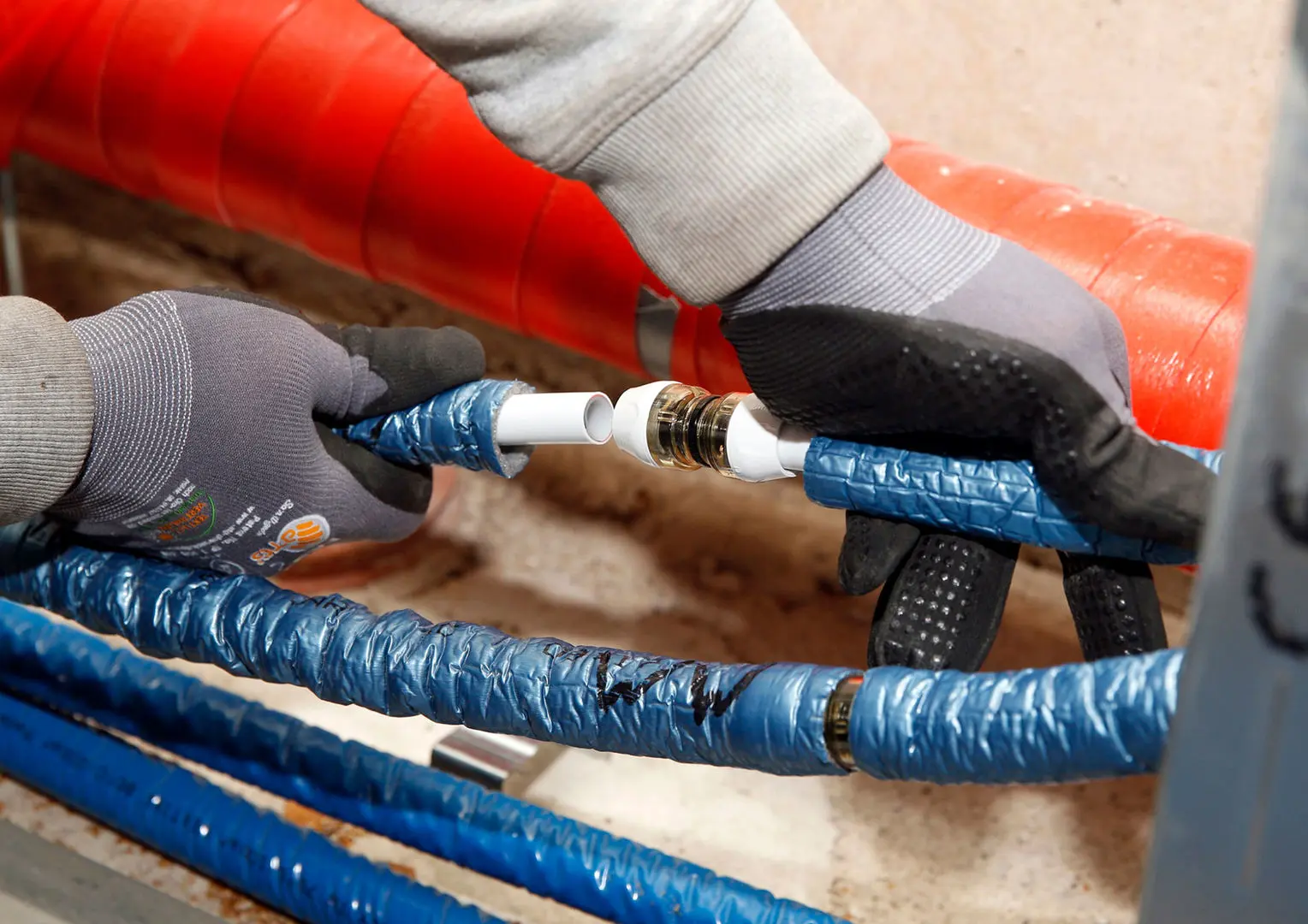 The loop-through ring installation in the 52 units and the connection of the radiators were carried out throughout with the pre-insulated multi-layer composite piping Uni Pipe PLUS. This is characterized by its narrow bending radii as well as high form stability. The pipe connections are realized with the RTM-Fittings with integrated press functions, without requiring tools, thus allowing rapid and reliable processing. This made it possible to lay about 12 kilometers of composite piping without a single classic mechanically pressed connection – thus reducing the required installation time by approximately 90 working days.