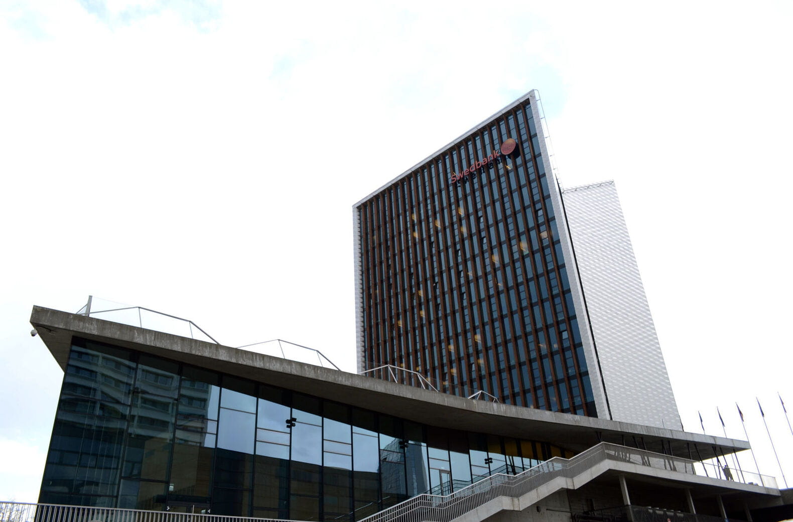 Administracinis Swedbank pastatas, kuriame teikiamos visos finansinės paslaugos, su žmonėms atvira terasa.
