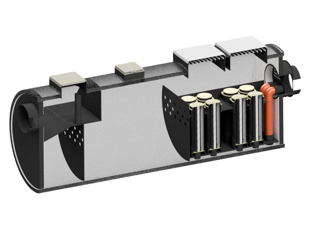 - Vault lietusūdens attīrīšana iekārta ir veidota kā attīrīšanas rezervuārs ar filtriem