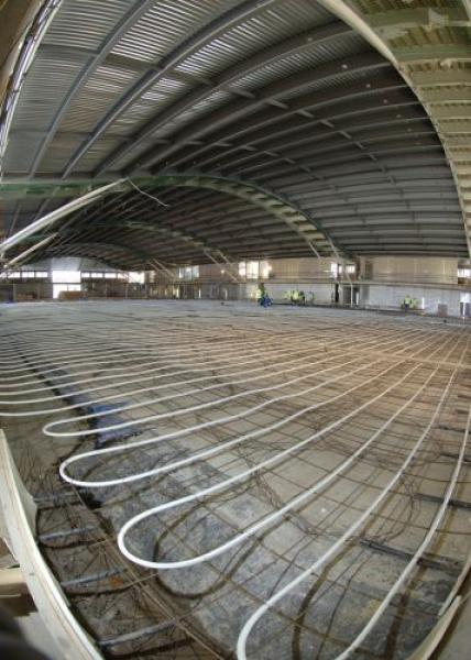 The environmental ambience created by Uponor's underfloor heating is very similar to that needed for perfect human conditions. Tests have shown that perfect heating comfort comes from providing a warm feet, cool head situation. Whereas conventional heating methods circulate heat around a room and often over the head of the recipients. This makes methods of heating such as radiators extremely inefficient in large spaces. In addition, by having all of the heating in the floor, the useable space of the facility is increased. The PEX material is extremely long lasting and offers a 50 year minimum service life.
