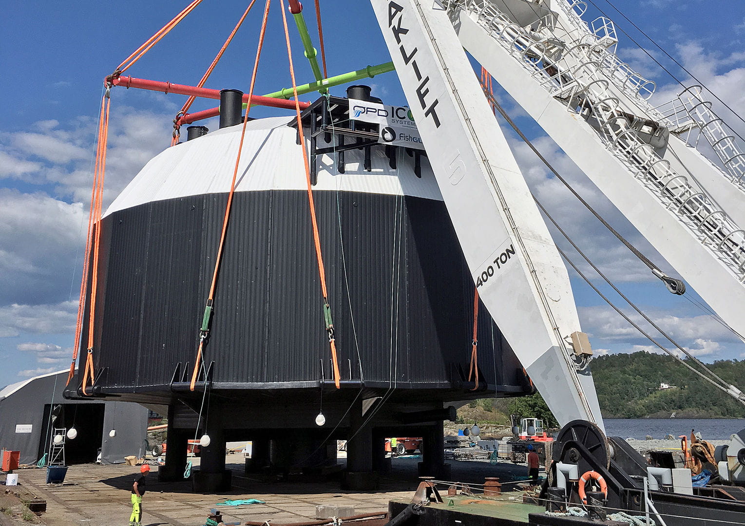 Så høy som en boligblokk. En diameter på 22 meter. Volumet utgjør 3.500 kubikk. FishGLOBE V5, et oppdrettsanlegg bygget og levert til FishGLOBE AS i Stavanger i Sør-Vest Norge, og er verdens største PE-plastbygg, designet for maritime forhold. Den første fisken - 250 000 ung laks - ble overført til denne futuristiske bygningen i november