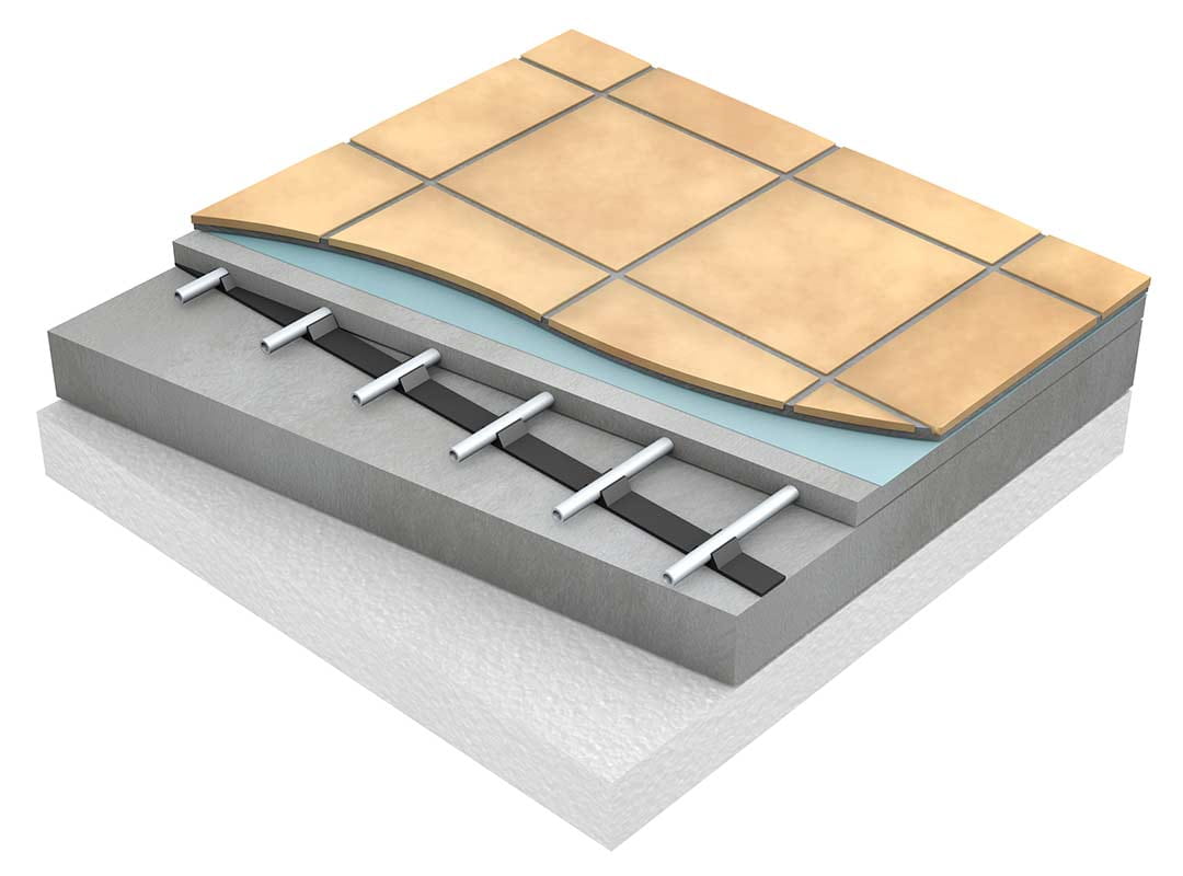 Varmesløyfer montert i Uponor Fix Festeskinne med mothaker som festes i isoleringen (min 150 mm ved montering på mark), støpt i betong. Uponor Comfort Pipe PLUS rør 20 x 2,0 mm monteres i festeskinnens klemspor med c/c 300 mm mellom rørene. Uponor Comfort Pipe PLUS rør 16/17 x 2,0 mm monteres med c/c 200 mm mellom rørene. Eventuelt armeringsjern kan legges oppå gulvvarmesløyfe. Deretter støpes rørene inn og dekkes med minimum 30 mm betong, beregnet fra rørets øvre kant (flistykkelsen kan regnes inn i disse 30 mm).