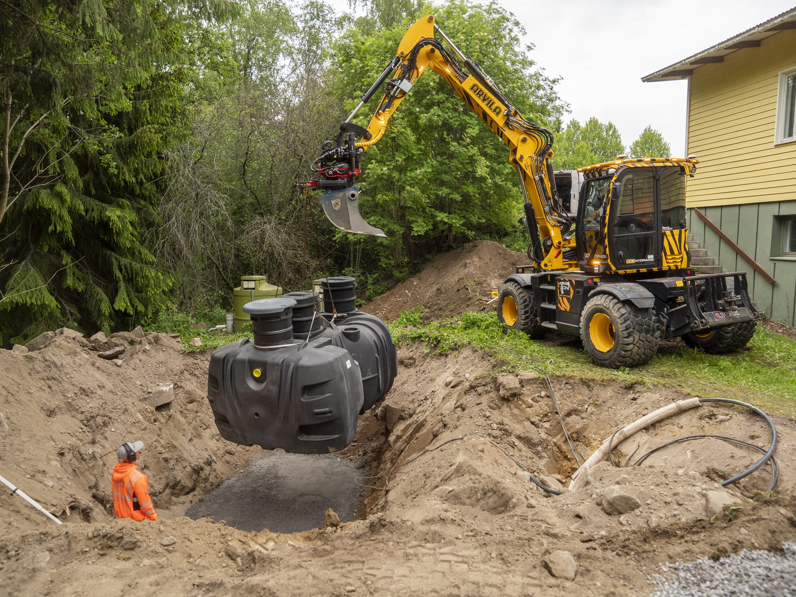 “Vi gravde en to meter dyp grøft ved siden av den eksisterende grøften og installerte det nye renseanlegget der. Avløpet var ikke ute av drift i mer enn 20 minutter, mens vi koblet de eksiterende avløpsrørene fra de tre bygningene til den nye inspeksjonskummen. Deretter fjernet vi det gamle renseanlegget, og kunne starte landskapsarbeidet allerede tredje dag,” sier Arvila.