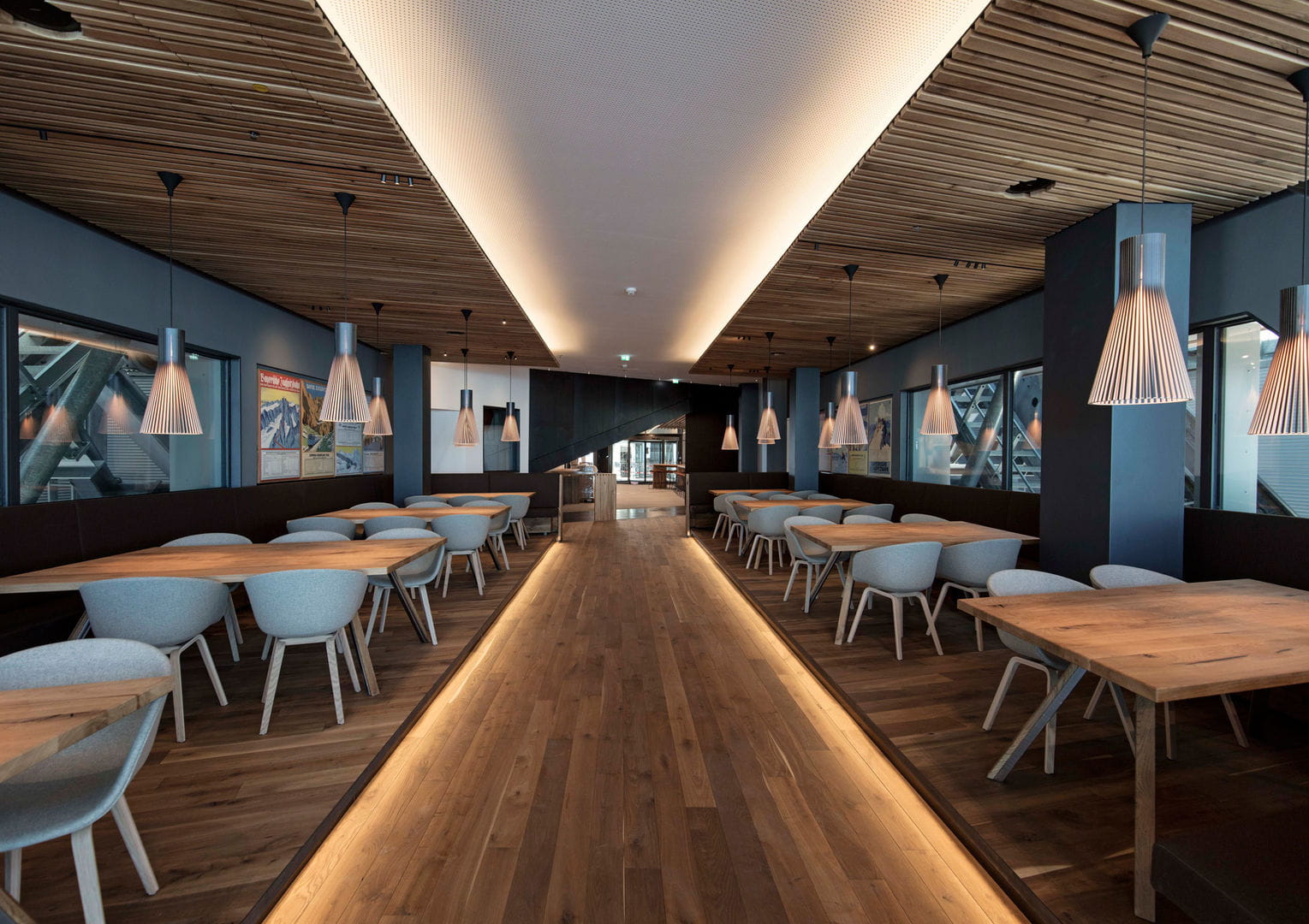 Visitors enjoy the warm interior ambiance of the Panorama 2962 summit restaurant all the more because outdoor air temperatures atop the Zugspitze rarely climb higher than five degrees Celsius (41°F), even in midsummer. Some 720 m² of Uponor underfloor heating Classic ensure comfortable radiant heat throughout the restaurant's interior. Radiators and air curtains are used in the entrance area and in the stairwell.