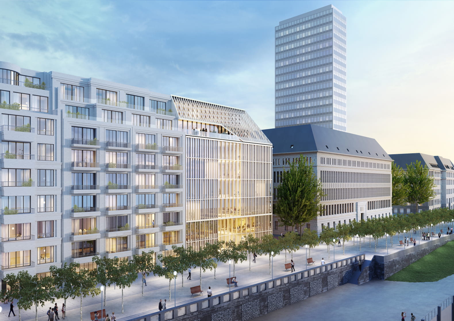 The largest independent tour operator in Germany, Alltours, is building a new company headquarters in Düsseldorf. In future, 13,500 square meters of office space will provide enough room for around 630 employees. The new building is in a prominent location: the office building is being constructed directly on the banks of the Rhine - opposite the listed Behrensbau building and in the immediate vicinity of the Mannesmann high-rise. The defining design element of the new ten-storey building is a filigree, vertically structured façade structure that continues up to the sloping roof. With its striking but visually calm agency language, the building blends harmoniously into its surroundings. In the middle of the building complex, a connecting atrium is being created, which offers a high quality of stay all year round thanks to its bright and attractive atmosphere. In future, employees will be able to relax on the top floor of the building - on the outdoor terrace, in the chill-out area or in an area with sports and health facilities.