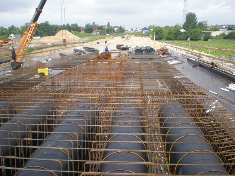 After prerequisite construction work on the viaduct was completed, the pipes were placed between reinforcement bars of the viaduct’s spans. The pipes were then secured with additional reinforcement, to prevent ejection by uplift force during the pumping of concrete. Pumping concrete grout into the spans constituted the final stage of the installation. According to the contractor overseeing the project, everything went smoothly and according to plan.