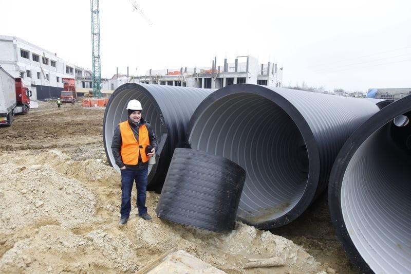 Work on first such sewer began in 2015 in Krakowska-Południe, a fast developing housing district in Rzeszów. Daniel Słyś who acted as consultant for the installation comments: “The new sewer in Rzeszów was designed to regulate the volume of storm water transported from the new housing developments into the existing municipal wastewater network. Due to required retention capacity of the sewer and limited installation space the diameter of the pipe was set at 2,4 m.”