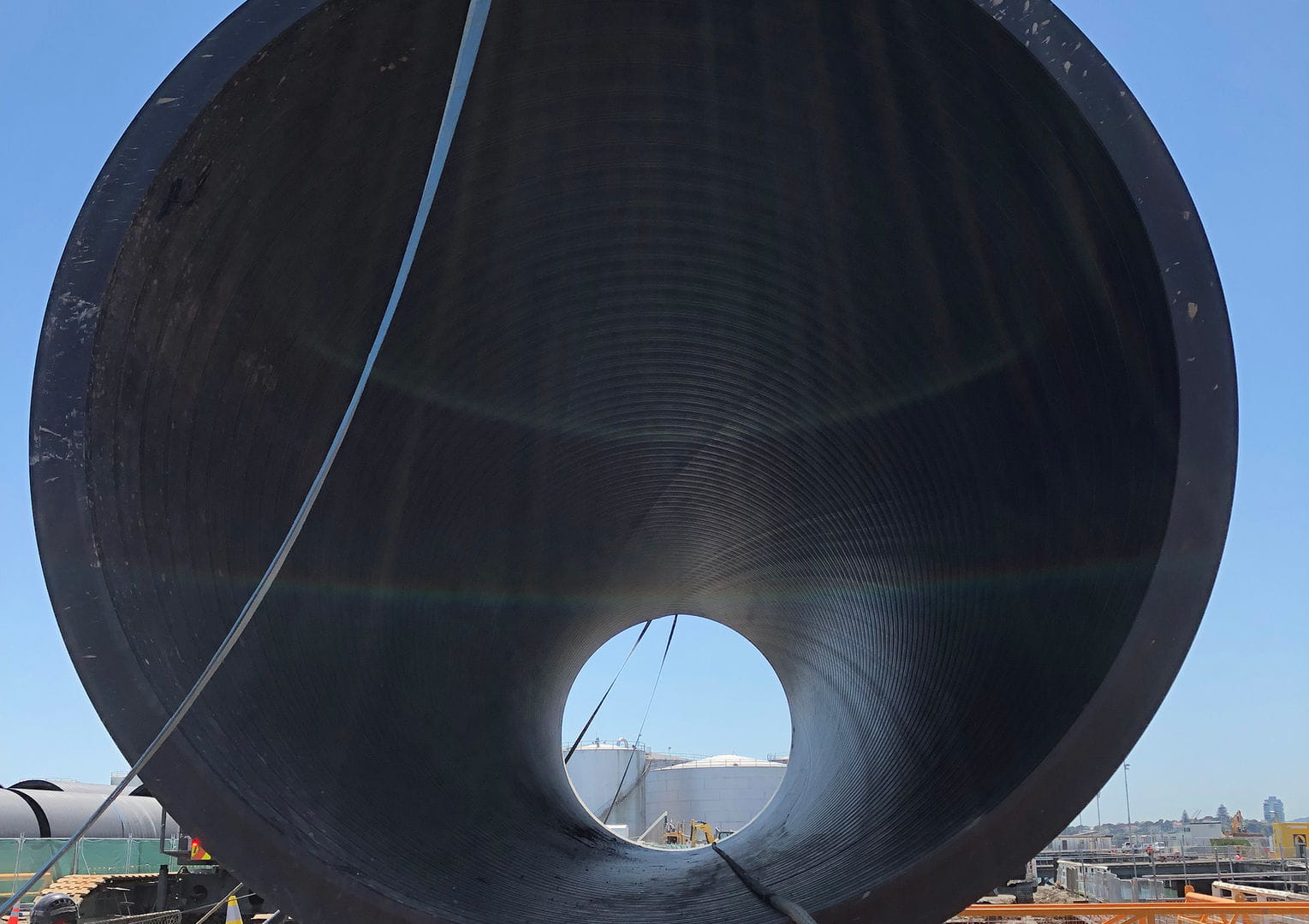Weholite pipes are light and easy to install. They really come into their own in a project in the harbour of Auckland, the largest city in New Zealand – the extension of an old stormwater line using massivepipes with an internal diameter of 3–3.5 metres. In this busy harbour area, it is not possible to carry outlarge-scale excavation work. The soil of the region and strong tides pose their own challenges.