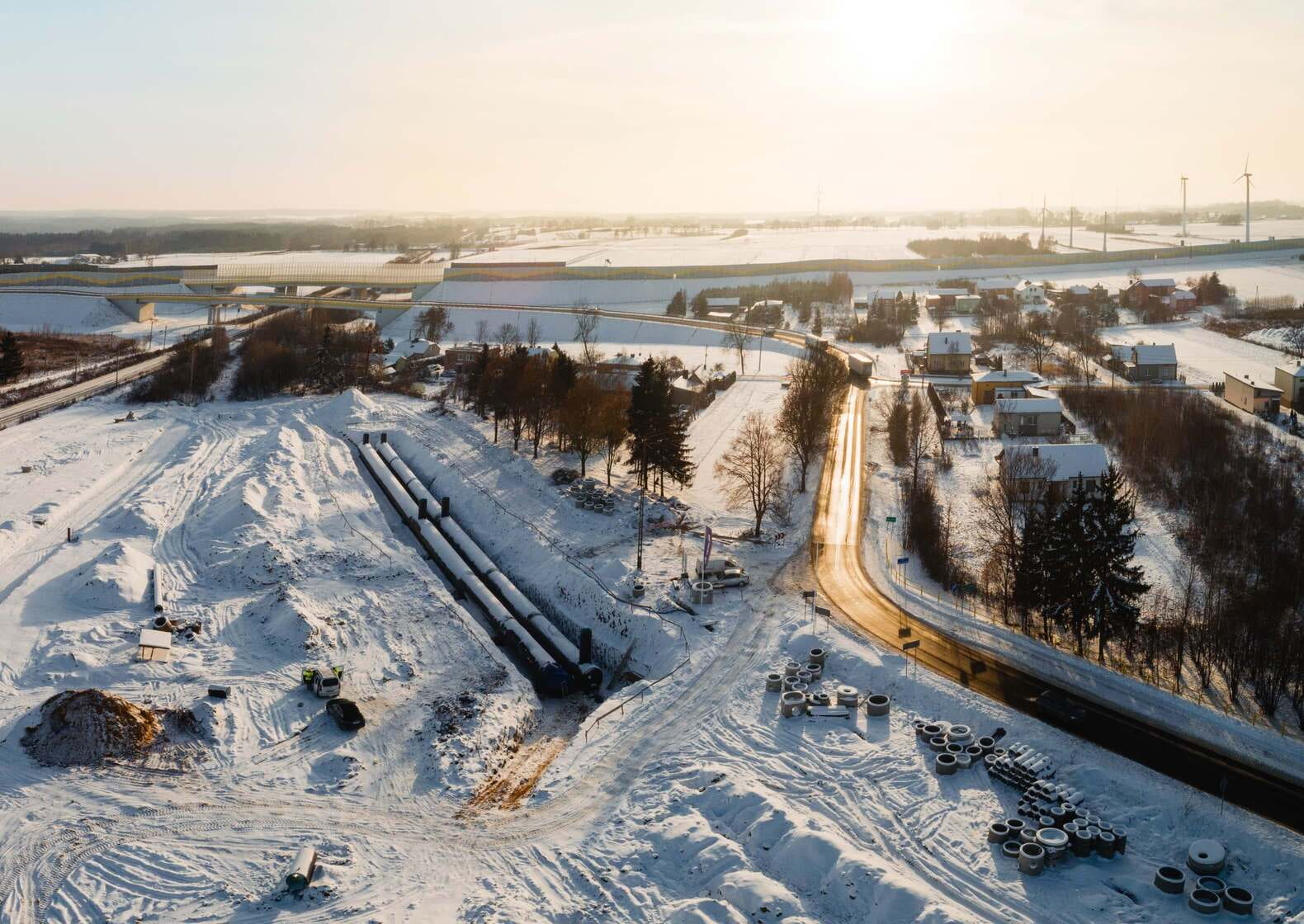 A battery of two polyethylene tanks DN2000 with a length of 98 m each and a total capacity of 615 m3 was installed under the future car parks, parallel to each other and simultaneously along the railway tracks. They were delivered to the construction site in the form of individual components, while the Uponor Infra Service Group already joined them into a single system on site by means of extrusion welding. It is worth noting that although the works were carried out in winter conditions, at temperatures as low as -20°C and with snowfall, the joining of individual elements went according to plan and unfavorable circumstances did not cause the work to be interrupted. At the end of the assembly work, the supplier carried out a simplified air tightness test of the tanks in the profile.