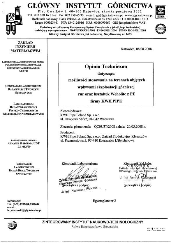 Opinia Głównego Instytutu Górnictwa (GIG) na rury i kształtki Weholite PE