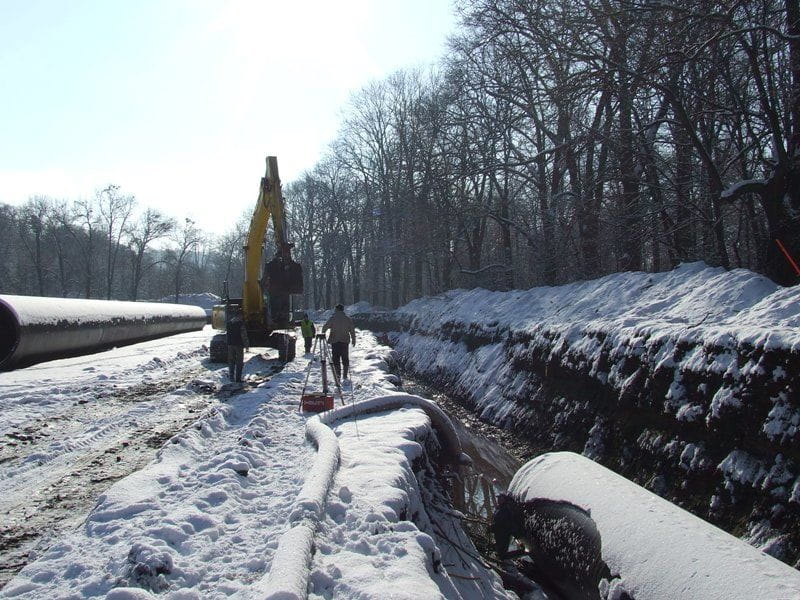 Rury Weholite łączono w odcinki o długościach od 50 do 100m metodą automatycznego spawania ekstruzyjnego na powierzchni terenu. Po posadowieniu w wykopie wykonano połączenia sekcji. Za połączenia odpowiedzialny był Serwis Uponor Infra. Taki sposób montażu zapewnił nie tylko stuprocentową szczelność i jednorodność połączeń na całej długości rurociągu, ale również sprawdził się w trudnych warunkach zimowych. Kolejną korzyścią wynikającą z zastosowania technologii Weholite była możliwość łagodnego wyginania rurociągu dzięki elastyczności rur. Ułatwiło to operację przenoszenia i posadowienia rurociągu w wykopie oraz pozwoliło na rezygnację z łuków segmentowych i bloków oporowych. To z kolei pozwoliło inwestorowi zaoszczędzić czas i pieniądze.