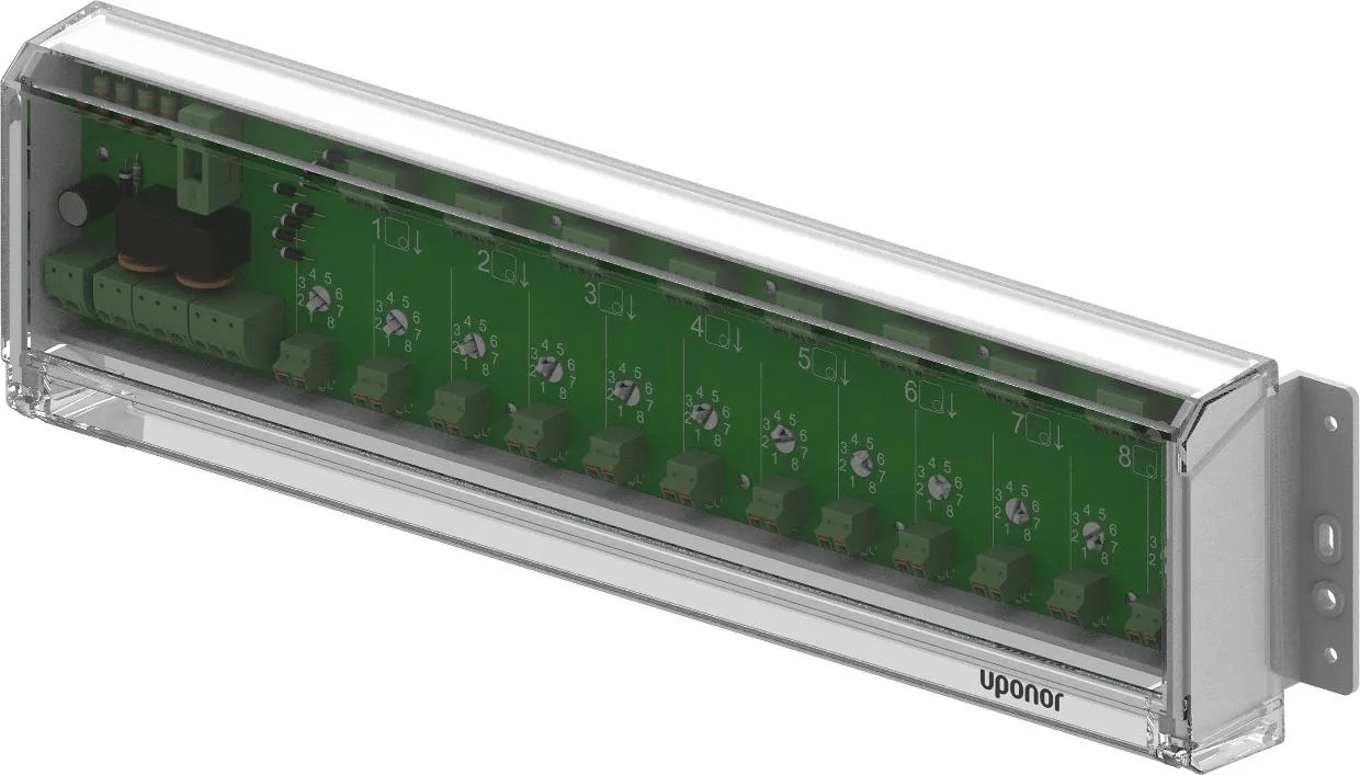 - podłączenie do 8 termostatów (230 V)- podłączenie do 12 siłowników (230 V)- obrotowy przełącznik kanałów do szybkiego przypisywania siłowników- przekaźnik pompy (styk: maks. 2(1) A, bezpotencjałowy)- zabezpieczenie przeciążeniowe- stopień ochrony: IP44Zawiera:- Uponor Base flexiboard ze sterowaniem pompą X-28- materiały montażowe