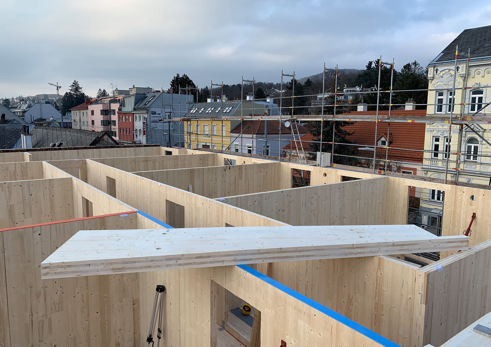 Wood as a building material makes green building much easier, it has a neutral CO2 balance compared to other building materials: One ton of CO2 is bound in every cubic meter of wood. With solid wood construction, i.e. building with multi-layer solid wood panels glued at right angles to one another, large quantities quickly accumulate - around 600 m³ of solid cross laminated timber were used for the new building. "Holzwohnen" thus stores 600 tons of CO2, which roughly corresponds to the pollutant emissions of ten cars over a period of 37 years.