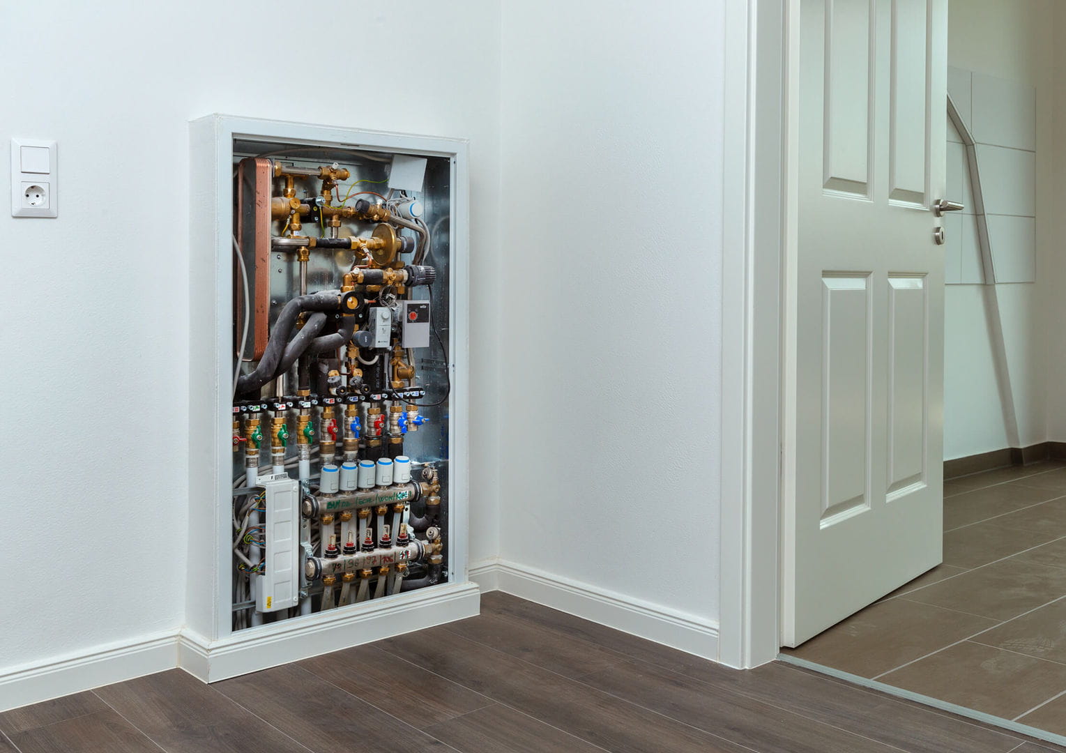 Room heating system water is supplied centrally from each building’s utility service entrance room from where it's routed via the heating supply line directly to each unit’s dedicated hot water station. Residents regulate their room heating individually. Heat consumption for room heating and hot and cold water supply is recorded by heat and water meters in the unit's consumer station, enabling highly accurate billing based on each apartment's consumption.