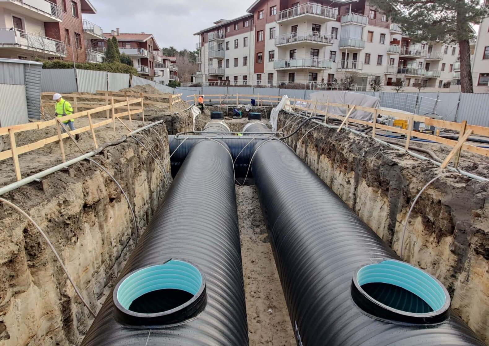 Uponor Infra dostarczyła na teren osiedla Neptun Park zbiorniki retencyjne PE SN8 DN2400 o łącznej pojemności V=510m3, które będą zbierały wody opadowe z terenu osiedla.