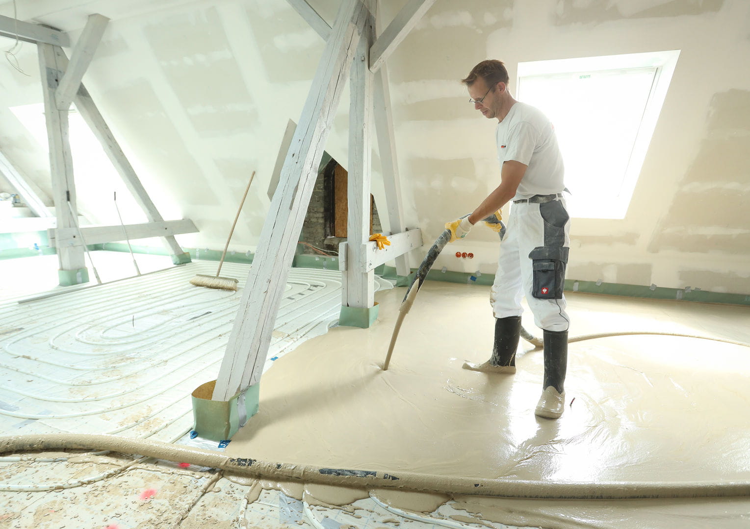 In attics with wooden joist ceilings, fire protection is a top priority. Uponor and Knauf had the right solution for a Berlin apartment building: underfloor heating with mineral fiber insulation, combined with a special fire protection screed.