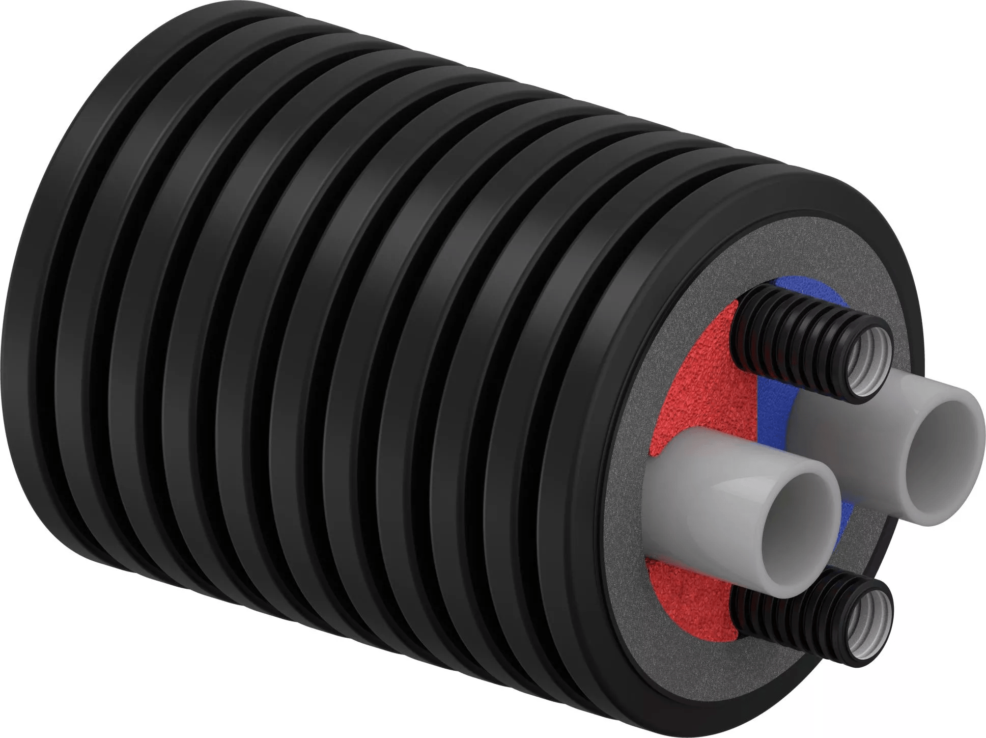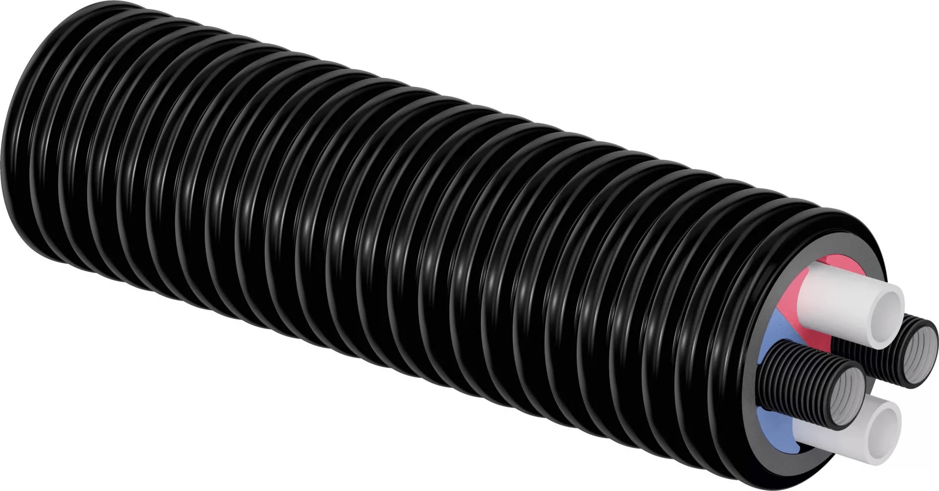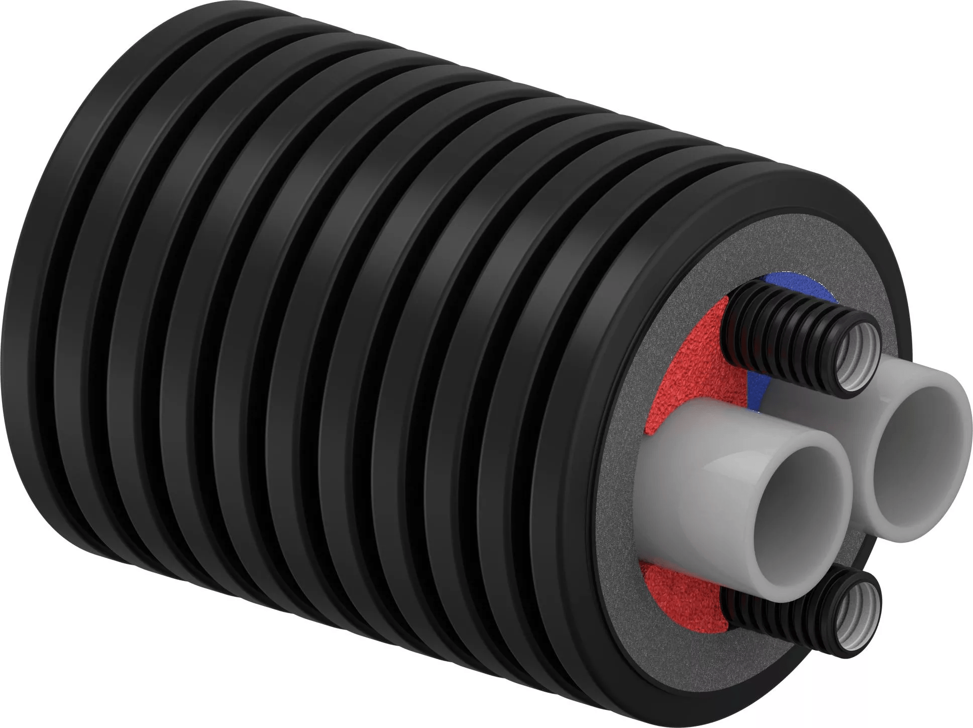 - Geotermia, aquecimento/arrefecimento.- 2 tubos de serviço PEX-a com barreira antidifusão de oxigénio, SDR11.- 2 tubos corrugados para cabos elétricos.- Pressão e temperatura máx: 6 bar / 95ºC.- Ida e retorno diferenciados.- Isolamento espuma PEX. Carcaça PEAD corrugado.