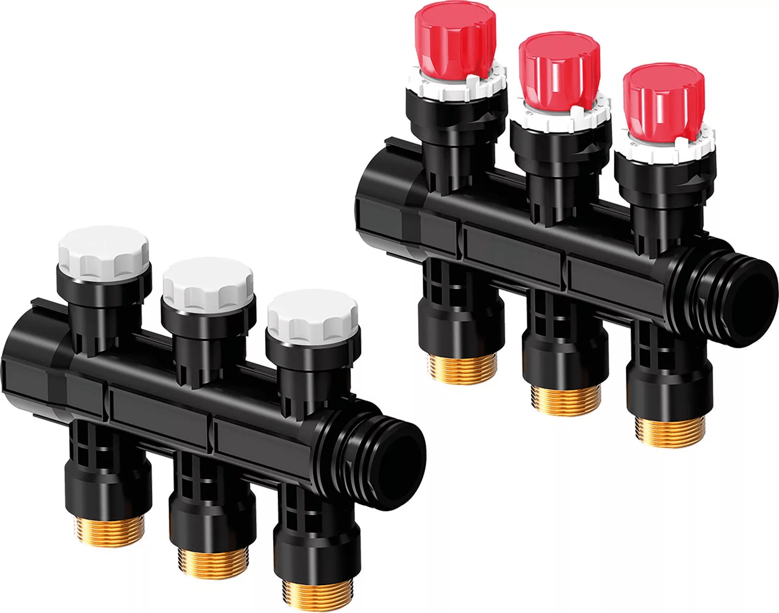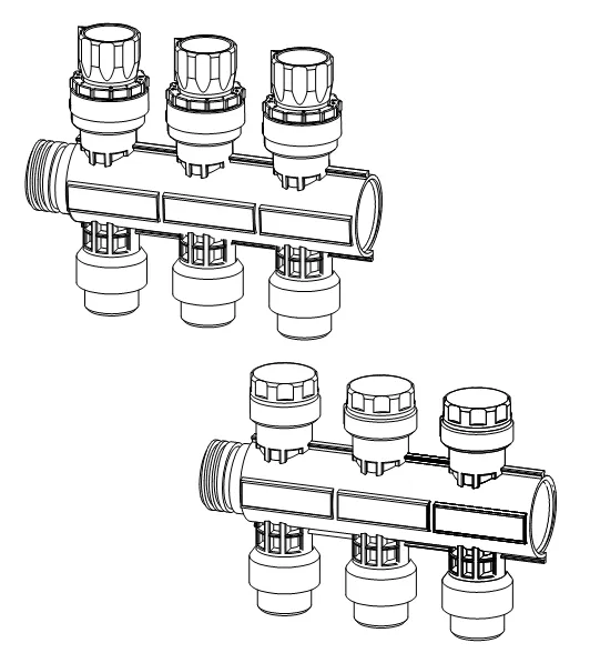 - Distribuitor modular din fibră de sticlă ramforsată cu poliamid cu 1,3,4,6 circuite pentru asamblare cu kit de montaj- Conectare pe stânga sau pe dreapta cu etanșare cu garnitură plată. Posibilitate conectare inferioară cu ajutorul coturilor din plastic.- Tur cu ventile de reglaj cu posibilitate închidere (LS) sau tur cu debitmetre de reglaj debit- Vizualizare debit și nivel închidere ventil- Inel de reglaj pentru echilibrare fără scule- Loc pentru etichete cu denumirea încăperilor- Ventile retur cu capac de închidere cu posibilitate de montare actuatoare- Racorduri de ieșire: G3/4" eurocon- Distanţa între racorduri de ieșire: 50mm- Distanța între distribuitor și colector: 225mm Actuator:- NC (normal închis) = închidere fără alimentare electrică