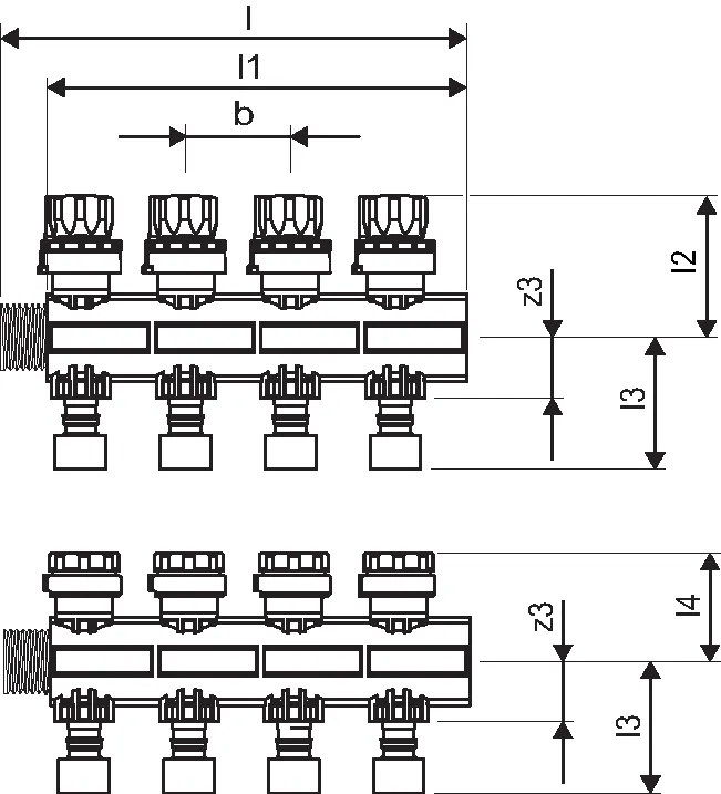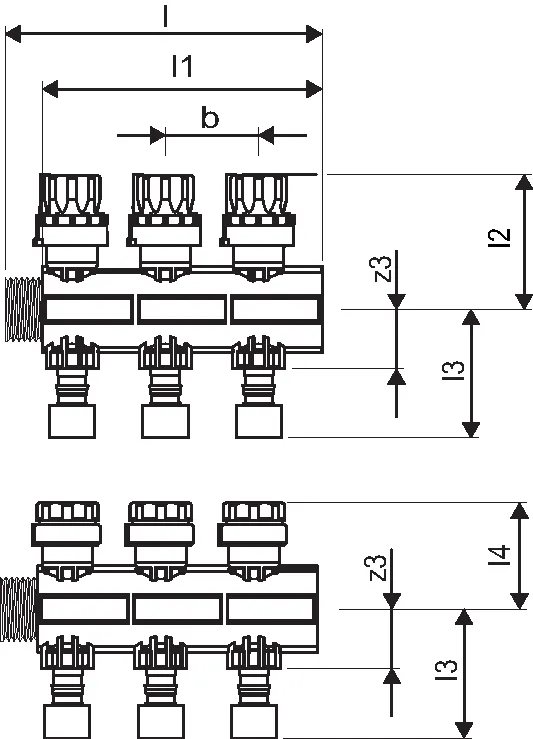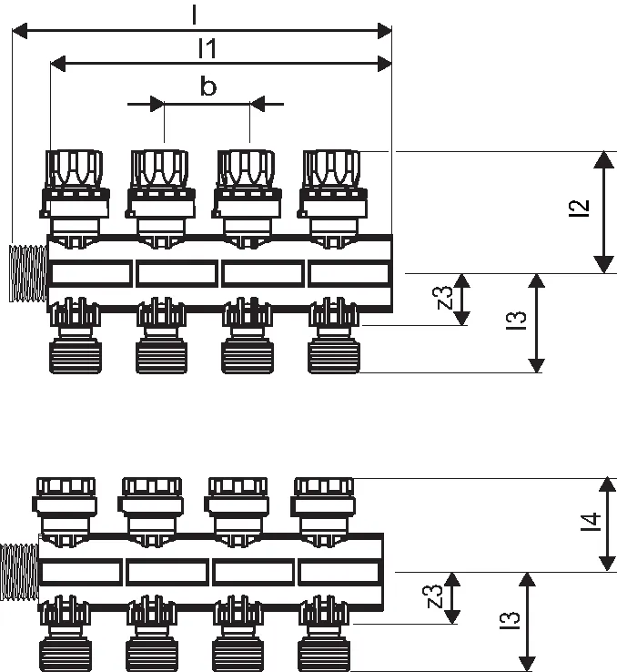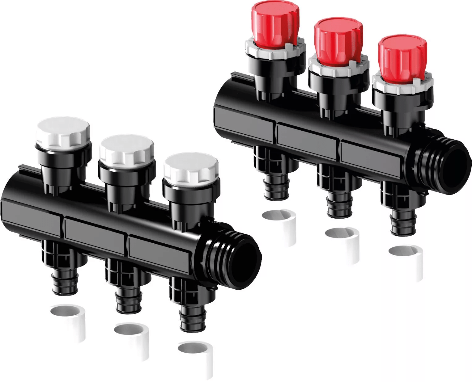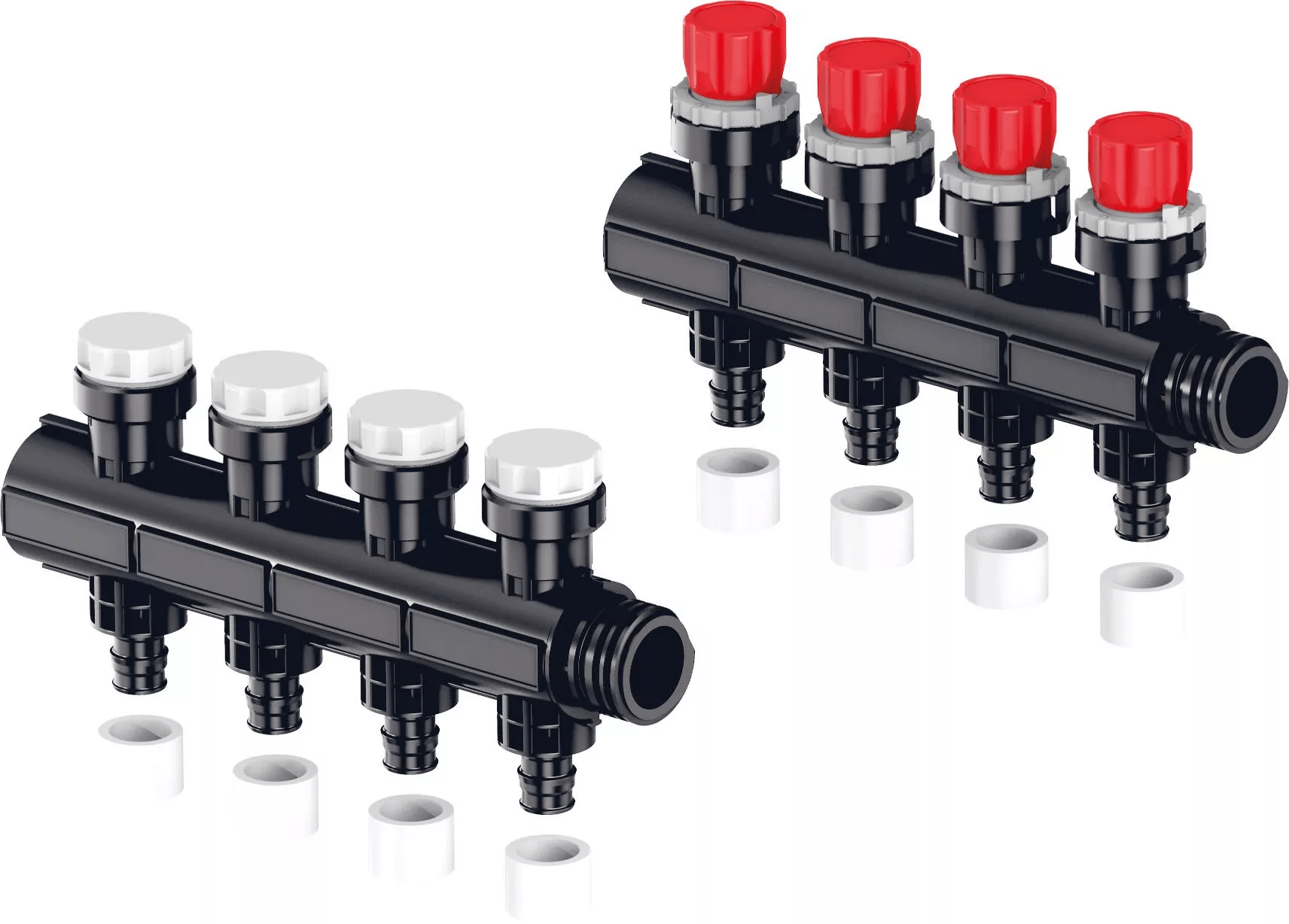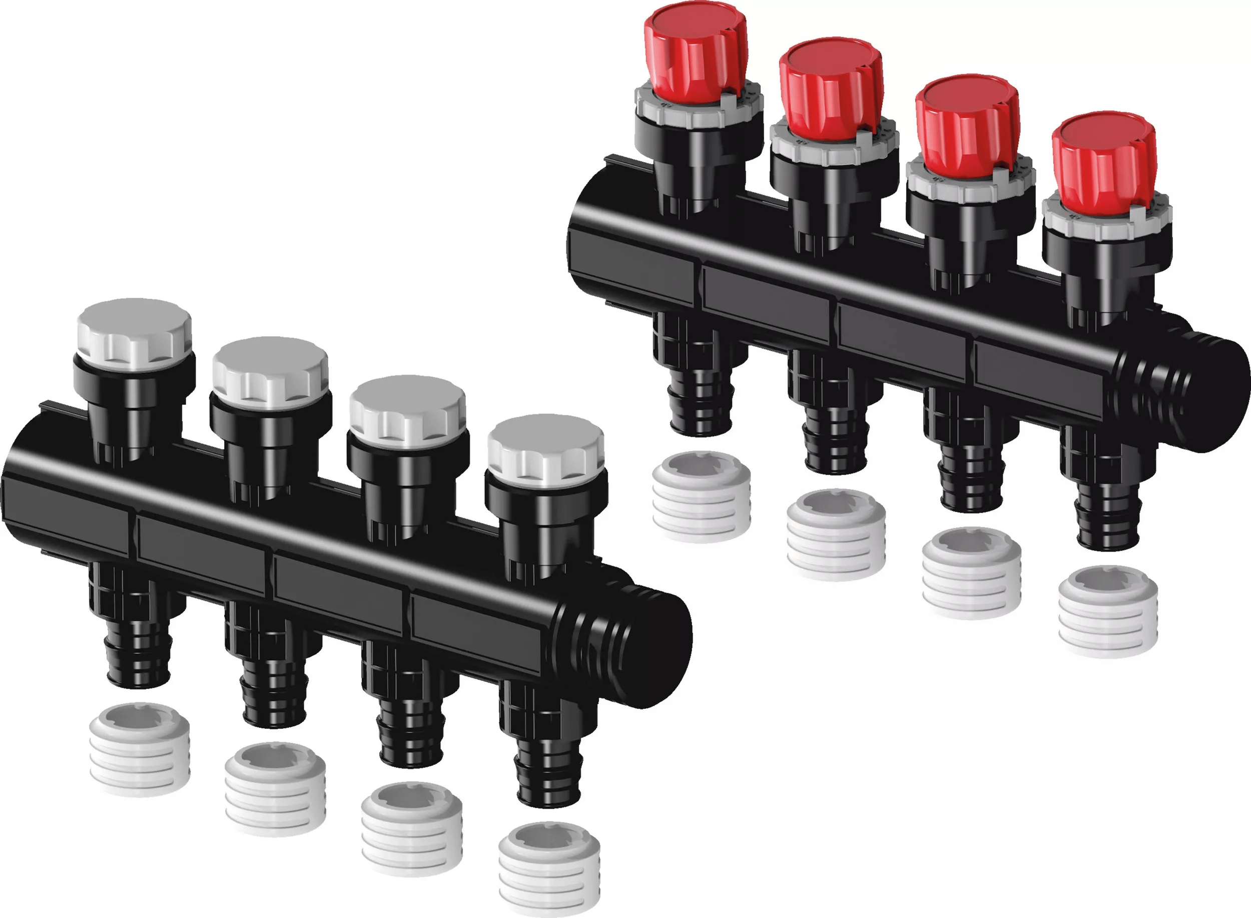 - Distribuitor modular din fibră de sticlă ramforsată cu poliamid cu 1,3,4,6 circuite pentru asamblare cu kit de montaj- Conectare pe stânga sau pe dreapta cu etanșare cu garnitură plată. Posibilitate conectare inferioară cu ajutorul coturilor din plastic.- Tur cu ventile de reglaj cu posibilitate închidere (LS) sau tur cu debitmetre de reglaj debit- Vizualizare debit și nivel închidere ventil- Inel de reglaj pentru echilibrare fără scule- Loc pentru etichete cu denumirea încăperilor- Ventile retur cu capac de închidere cu posibilitate de montare actuatoare- Racorduri de ieșire: G3/4" eurocon- Distanţa între racorduri de ieșire: 50mm- Distanța între distribuitor și colector: 225mm Actuator:- NC (normal închis) = închidere fără alimentare electrică