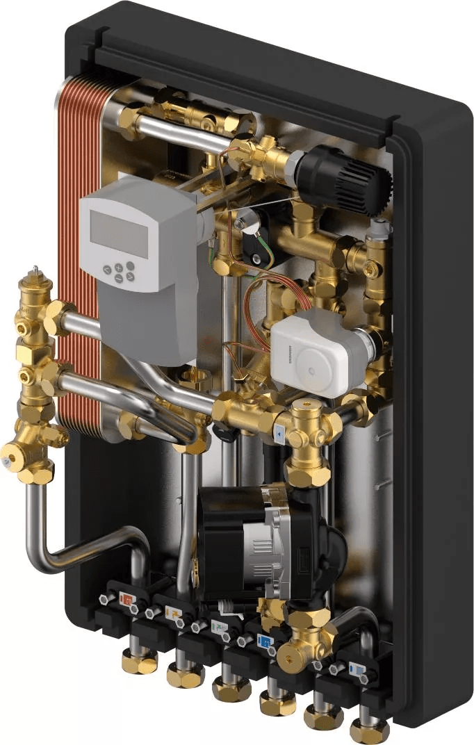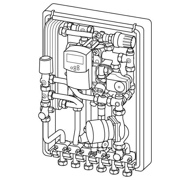 - Modul termic pentru producere apă caldă și încălzire- Set de amestec secundar cu pompă circulație pentru încalzire în pardoseală și vană termostatică pentru alimentarea cu încălzire 20-50°C- Control termostatic temperatură a.c.m. (TWB)- Actuator 230V pe robinetul de zonă pentru conectarea la termostatul de cameră- Control temperatură agent termic cu compensarea temperaturii exterioare, control vană cu 3 căi, orar săptămânal cu 9 programe prestabilitei, logica pompei în combinație cu Uponor Smatrix Base sau controler Wave- Senzor tur- Senzor exterior- Amortizor "lovituri de berbec" pentru compensarea șocurilor hidraulice- Regulator de presiune diferențială pe circuitul de încălzire primar