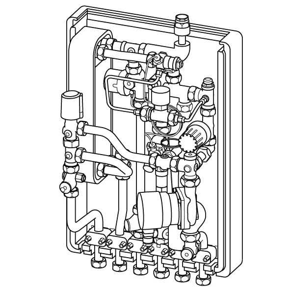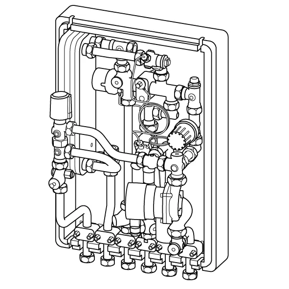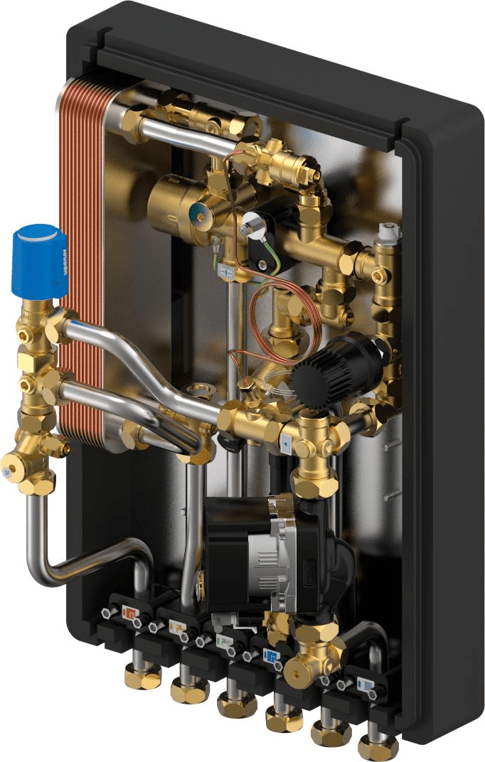 - Modul termic pentru producere apă caldă și încălzire- Set de amestec secundar cu pompă circulație pentru încalzire în pardoseală și vană termostatică pentru alimentarea cu încălzire 20-50°C- Actuator 230V pe robinetul de zonă pentru conectarea la termostatul de cameră- Regulator de presiune diferențială pe circuitul de încălzire primar