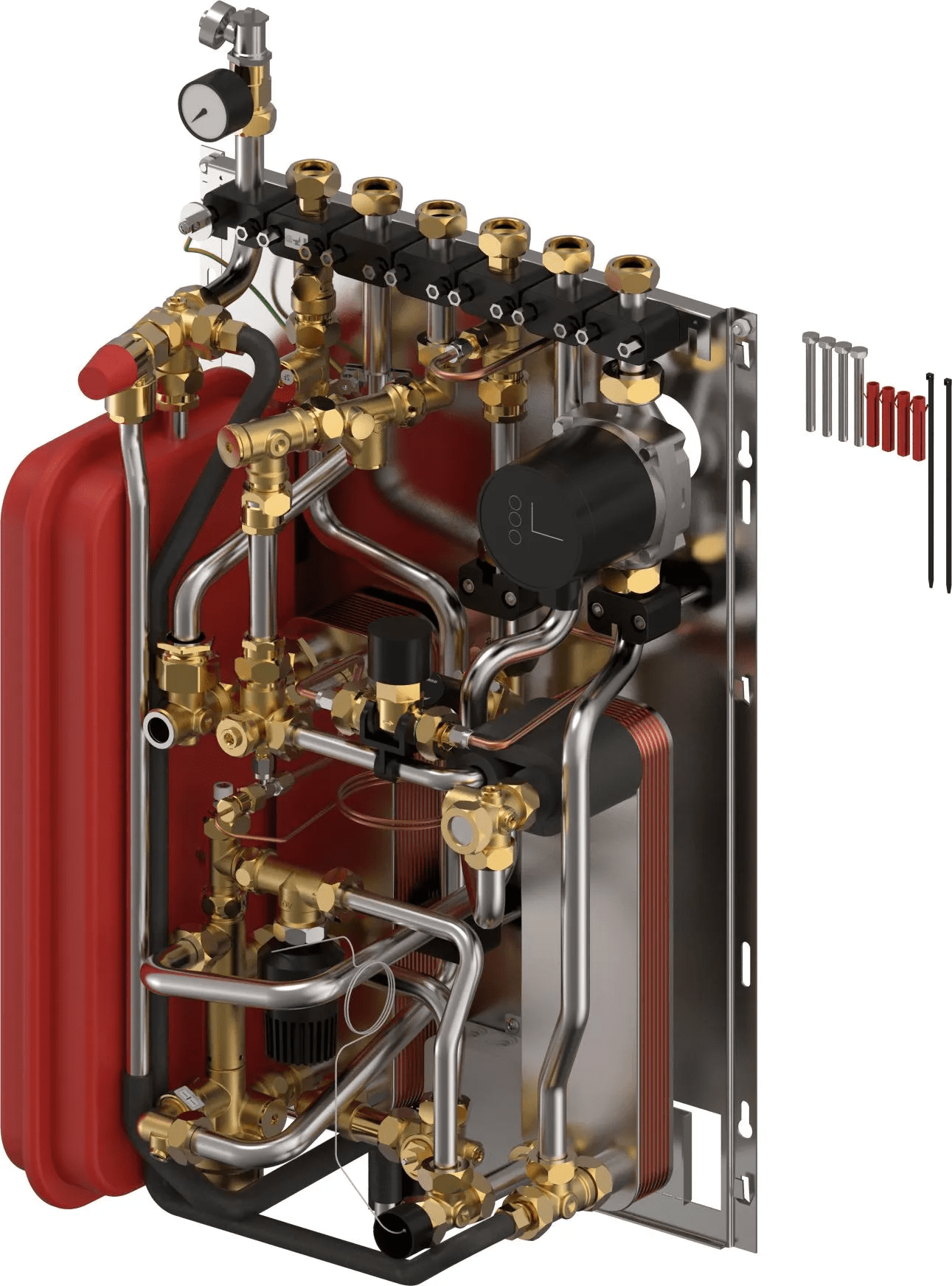 - port complet asamblat și testat la presiune- robinet PM certificat DVGW, cu tehnologie brevetată de etanșare triplă- coliere de țevi fabricate din plastic, pentru protecție solidă și decuplare termică- 2 schimbătoare de căldură: pentru încălzire și apă caldă menajeră- supapă termostatică de bypass- pompă de circulație pentru căldură secundară cu control al temperaturii- distanțier pentru contor termic de 110 mm x 3/4"- distanțier pentru contor de apă de 110 mm x 3/4"- robinet de umplere și golire- sită pentru apă rece de 0,5 mm- sită pentru conductă de alimentare pentru încălzire primară de 0,5 mm- posibilitate de conectare (marcată) a unei urechi de împământare electrică- presiune max. de funcționare încălzire: PN10- presiune max. de funcționare instalație sanitară: PN10- temperatură max. de funcționare: 85 °C- presiune min. instalație sanitară primară: 2 bari- presiune diferențială max. încălzire primară: 2,5 bari- material fitinguri instalație sanitară: CW617N- material fitinguri încălzire: CW617N, CW614N- țevi: oțel inoxidabil 1.4401- inclusiv capac pentru dulap, vopsit în câmp electrostatic cu pulbere albă (RAL 9016)