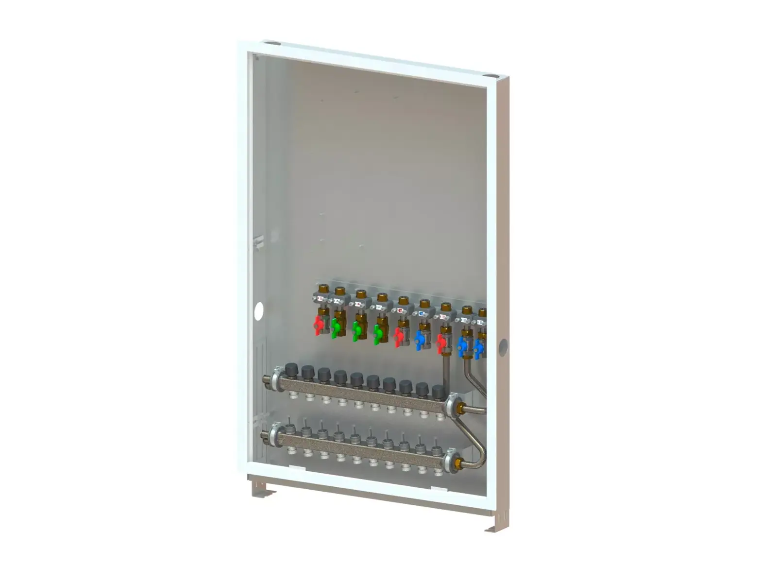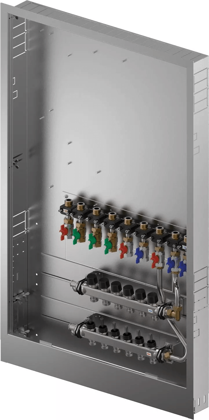 Nástenná skrinka s nožičkami, vykurovacím potrubím a koľajnicou s predinštalovanými guľovými ventilmi. Nepotrebné obvody je potrebné zapojiť na mieste.Kódy rozmerov:HMV – súprava rozdeľovačov Vario-S pre vykurovanie s _ (4,6,8,10) vykurovacími okruhmiBV – súprava 9 guľových ventilov predinštalovaných na montážnej lište vo vnútri skrinky pre pripojenie tepelného rozhrania