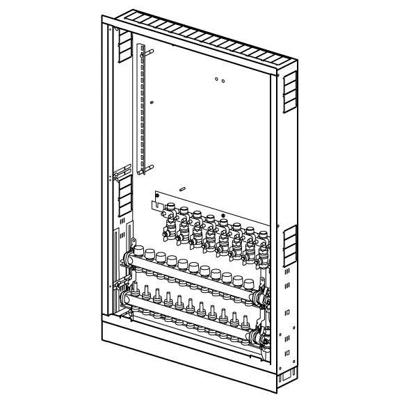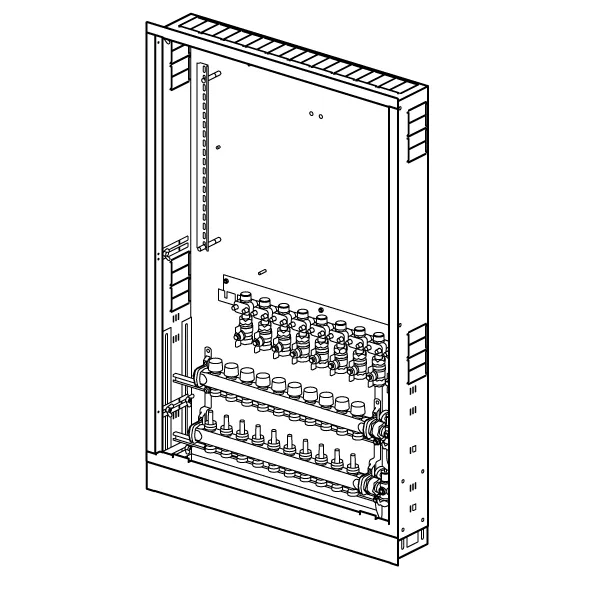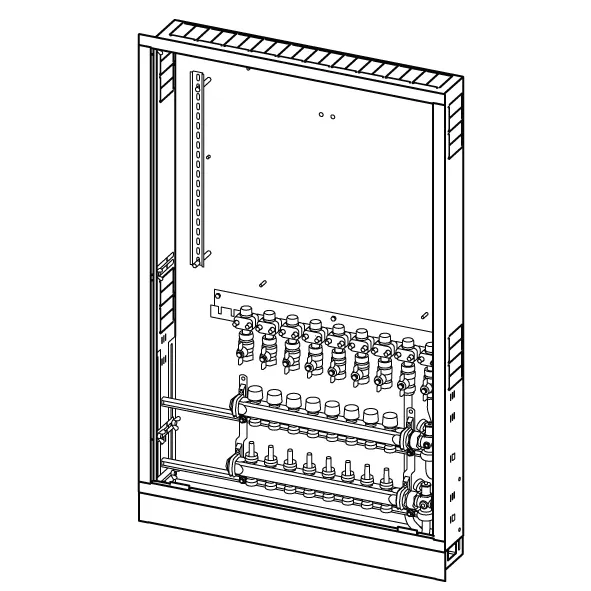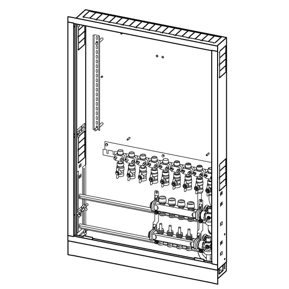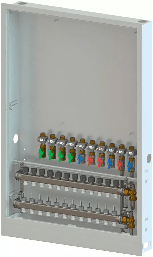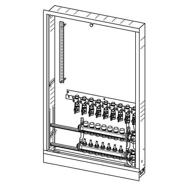 Podometna omarica, vključno z nogicami, razdelilcem za talno ogrevanje in letvijo s predmontiranimi krogelnimi ventili.Oznake za dimenzioniranje:_HMV - set razdelilcev Vario-S za ogrevanje z (3-11) ogrevalnimi zankami_BV - set _(7,9) krogelnih ventilov predmontiranih na montažno letev znotraj omarice, za priključitev stanovanjske toplotne postaje