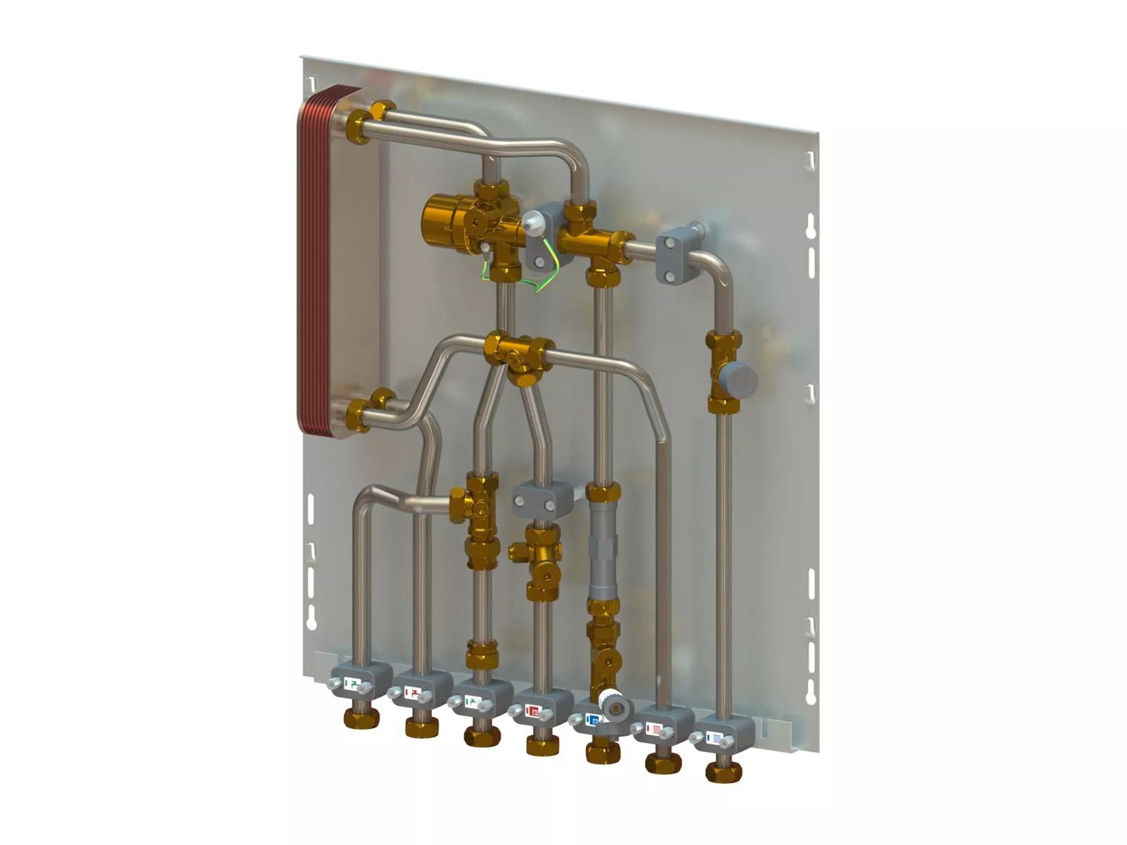 - popolnoma sestavljena in tlačno preizkušena enota (Port)- cevni pritrdilci izdelani iz plastike za zvočno zaščito in termično prepreko za prevod toplote- PM-regulator s certifikatom DVGW in patentirano tehnolgijo trikratnega tesnjenja- odcep hladne pitne vode- distančni kos za kalorimeter 110 mm- distančni kos za vodomer 110 mm- polnilno-izpustni set- lovilec nečistoče na primarnem dovodu ogrevne vode 0,5 mm- označeno mesto za priključitev kabla za izenačitev potenciala- maksimalni obratovalni tlak - ogrevanje: PN10- maksimalni obratovalni tlak - vodovod: PN10- maksimalna obratovalna temperatura: 85 °C- minimalni tlak pri vodovodu: 2 bar- material fitingov pri vodovodu: CW617- material fitingov pri ogrevanju: CW617N, CW614- material cevi: nerjavno jeklo 1.4401- mere: Š/V/G 556 x 620 x 110 mm