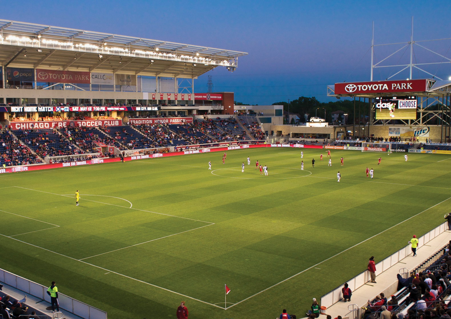 Toyota Park, the fourth major soccer-specific field in the United States, features a state-of-the-art Uponor turf-conditioning system that keeps the playing surface in excellent condition year-round, no matter the weather or temperature. The system circulates a warm, water-and-glycol mixture through PEX tubing buried underground. The intent is to warm the root zone beneath the grass so the playing surface remains soft and forgiving to falling players, even at sub-freezing temperatures.The radiant heating system consists of roughly 28 miles (nearly 150,000 linear feet) of ¾" Wirsbo hePEX™ tubing, that serpentines from end zone to end zone, eight inches on center and ten inches below the 200-foot by 425-foot playing surface. The only connections are at the copper manifolds, positioned at the south end of the field, where each PEX loop begins and ends -- thus removing potential service issues to outside the playing area. The copper headers are fitted with stub-outs at the factory for making the PEX connections, saving substantial time on the job site.
