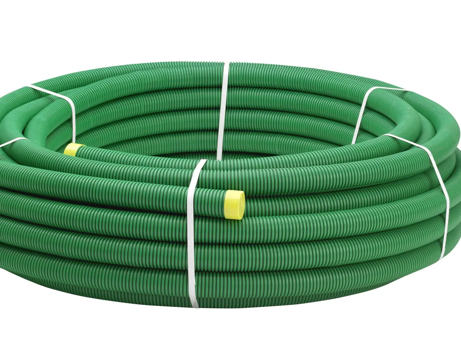 Dubbelväggigt rör på ring med dragtråd. Tillverkat i PE. SRN beteckning enligt EBR Kabelförläggning max 145 kV KJ 41:21.1. Tillverkad enligt kraven i EN 50626-1 och provningskrav enligt SS 424 14 37 7. Kabelförläggning i mark, utg 6. Ingjutningsbar i betong. Vanliga förutsättningar som måste uppfyllas: Röret ska fixeras ordentligt så att det inte flyter upp vid gjutning. Böjradie och belastning får inte överskridas. Skydd mot mekanisk skada från armoring.