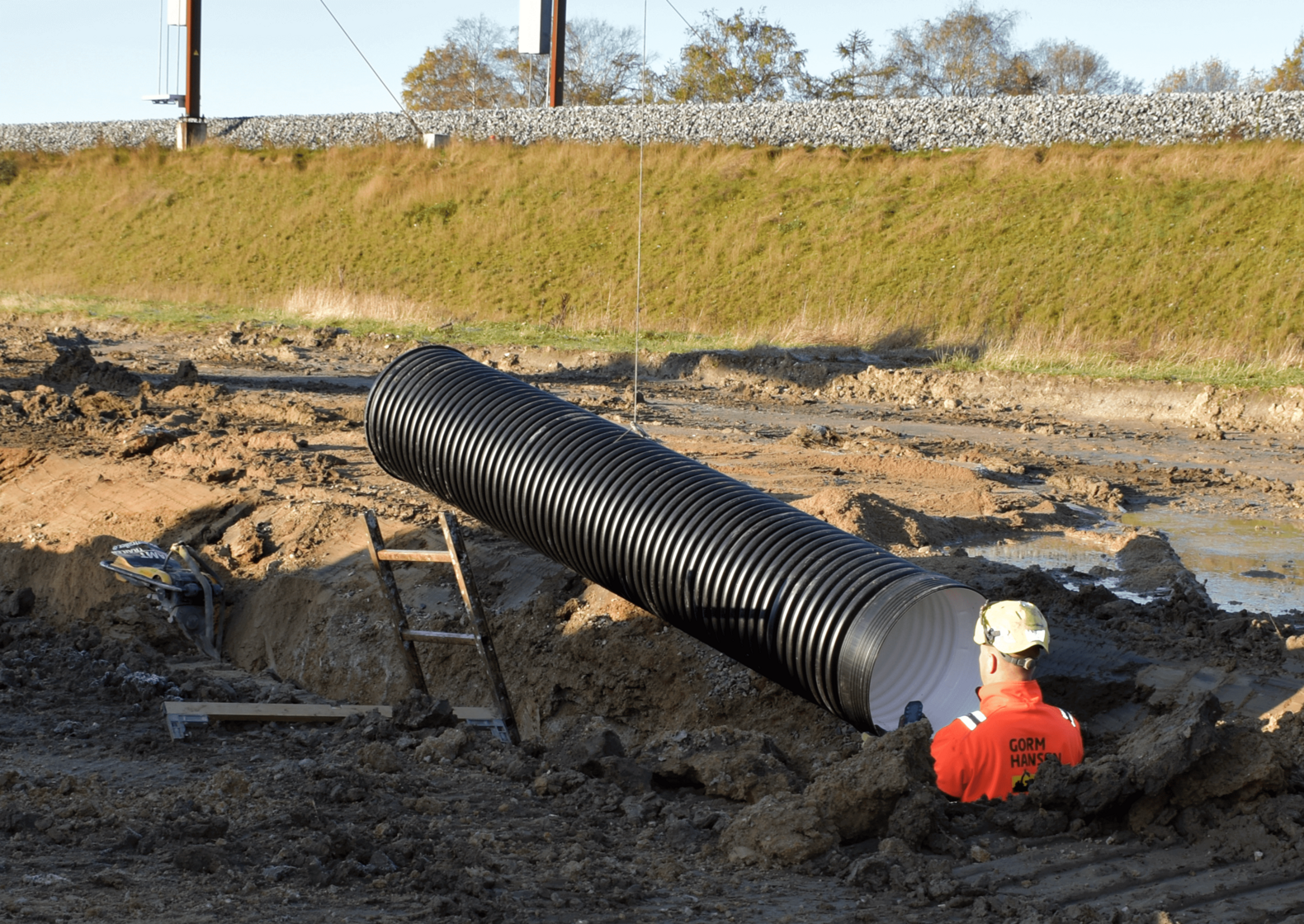 “Plastic pipes have a significantly longer service life, and it’s far easier for our team to work with plastic pipes, as they are just one-tenth the weight of concrete pipes. That saves both machine and labour resources. An added challenge is that the work site is close to a large road, with a lot of large supply lines and cables running underneath. To get under these, plastic pipes offer the most flexible solution,” Nielsen explains.