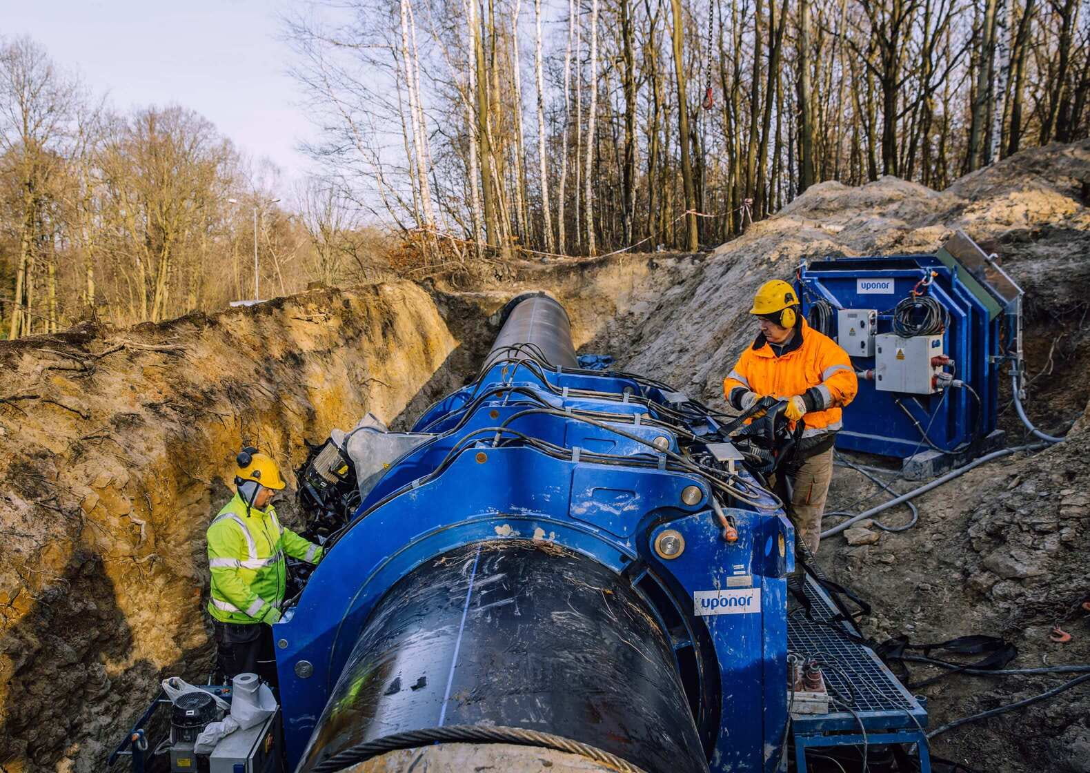 This task consisted in installing new pipe elements with diameters of 1,400 and 1,300 mm in an old steel pipeline with a diameter of 1,600 mm. On the one hand, because of the complexity of the terrain, and on the other hand – because of the speed of work, it was decided to use pressure pipes made of PE-HD polyethylene, manufactured by Uponor Infra sp. z o.o. 719 m of WehoPipe PE100 DN1400 x 53.5 PN6.3 SDR26 pipes, and 1,172 m of WehoPipe PE100 DN1300 x 77 PN10 SDR17 pipes were also used. Pipes were joined using butt welding, which guarantees one hundred percent tightness and uniform strength of the structure along its entire length. Such a solution made it possible to pull in such long sections of the pipeline and also to meet the requirements related to the execution of projects in the area of mining damage.