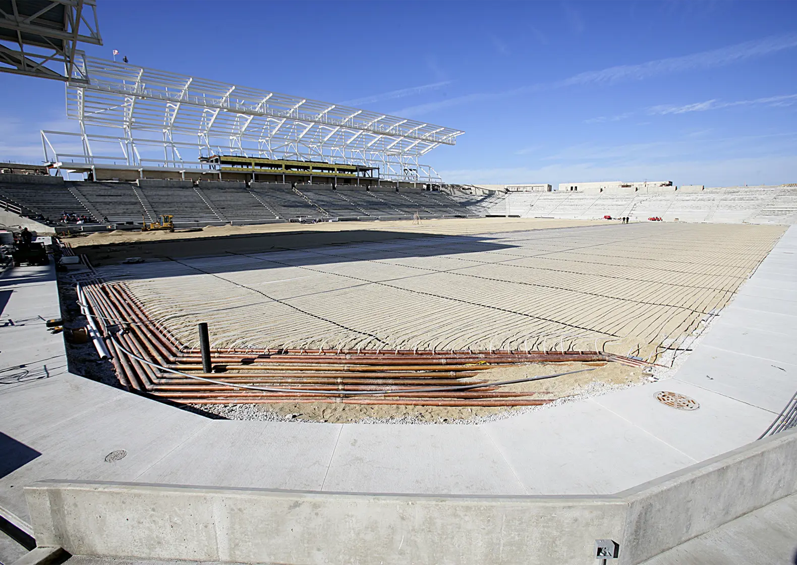Like the interior of a home or a large office, the field is segmented into four heating zones, also running the length of the field from goal to goal. Each zone contains 42 loops and two temperature sensors that sit within underground boxes connected to one another with plastic conduit. If any underground sensors ever need to be repaired, all eight are on a GPS (Global Positioning System), according to Bennett, enabling service personnel to pinpoint the positions of the underground boxes to within 18 inches. “We also provide a complete photo log of the boxes’ installation, which should also help in locating them,” he says.
