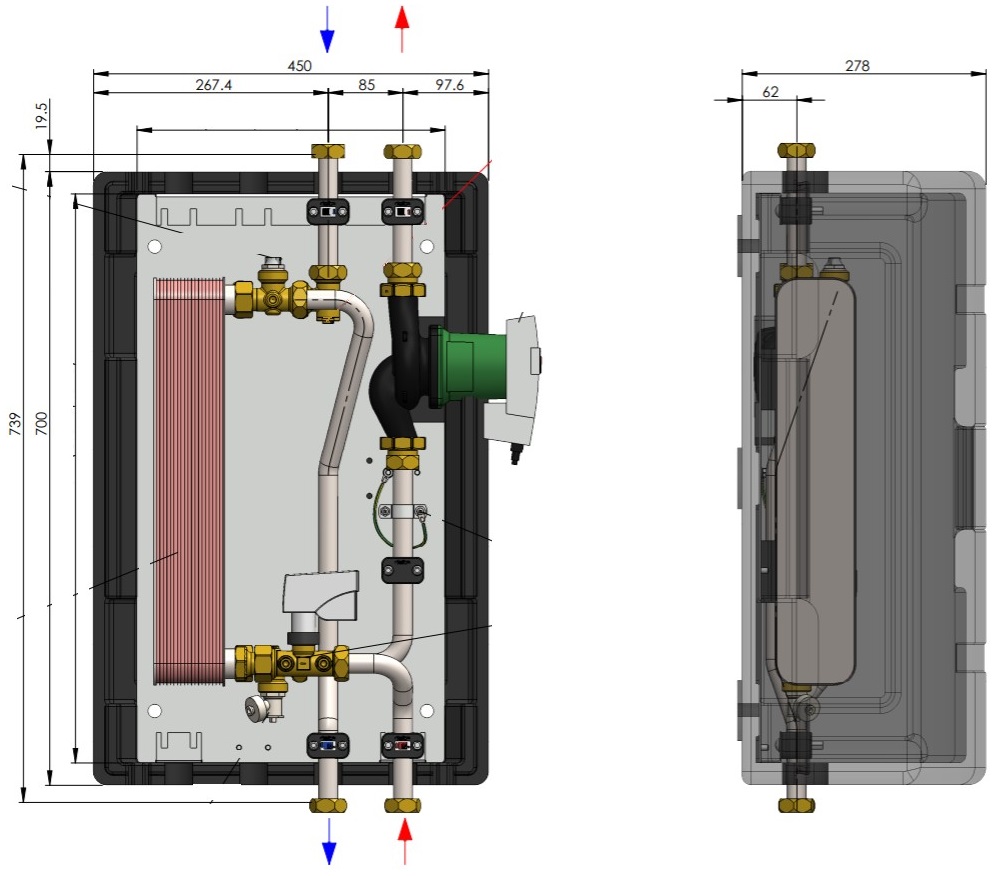 - Meltaway VVX‐shunt 60kW G1¼ inv (räcker till ca 255m² med ett effektbehov på 235 W/m²)