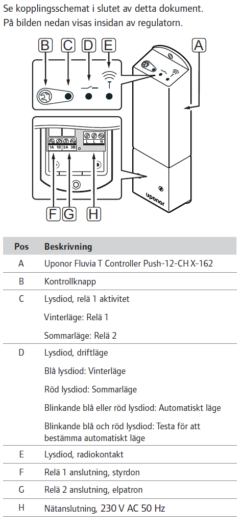 - Lampan i mitten(D) Röd = Aktivt sommarläge (Endast elpatron, styrdon alltid stängd), Blå = Vinterläge (Endast primärvärme, elpatron aktivera inte), Röd/Blå(blinkar ibland) = Automatiskt läge (Känner av själv när elpatron ska vara aktiv kontra om det finns tillgång till primärvärme) .