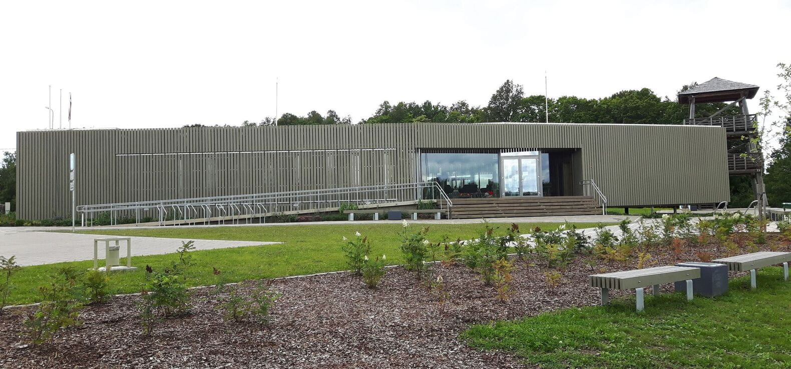 The technical design of the building was developed in 2015, construction works began at the end of February 2016. The building has strip-shaped foundations, on which a slab 250 mm thick is supported, above which a thermal insulation layer 300 mm thick is built. The foundation exhibition took 2 months. A diverse range of materials was used in the construction of the building - concrete, wood, metal, etc. Wood is very widely used - both as a frame and as a finishing material. There are two reasons for this: firstly, great emphasis was placed on the use of natural materials, and secondly, it is with the special woodworking technique that the design concept can be achieved. Local materials were mostly preferred.