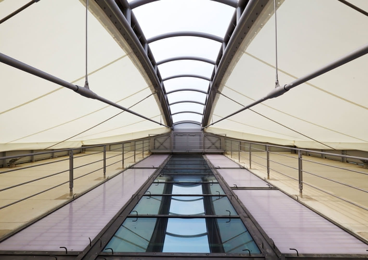 Designed by Thomas Rampp, the 3,580 m2 building represents a real game-changer thanks to its bright roof membrane. The translucent outer skin spans the multi-layered roof superstructure, providing weather protection. The revolutionary membrane coating is one of several unusual concepts and products being used for the first time.
