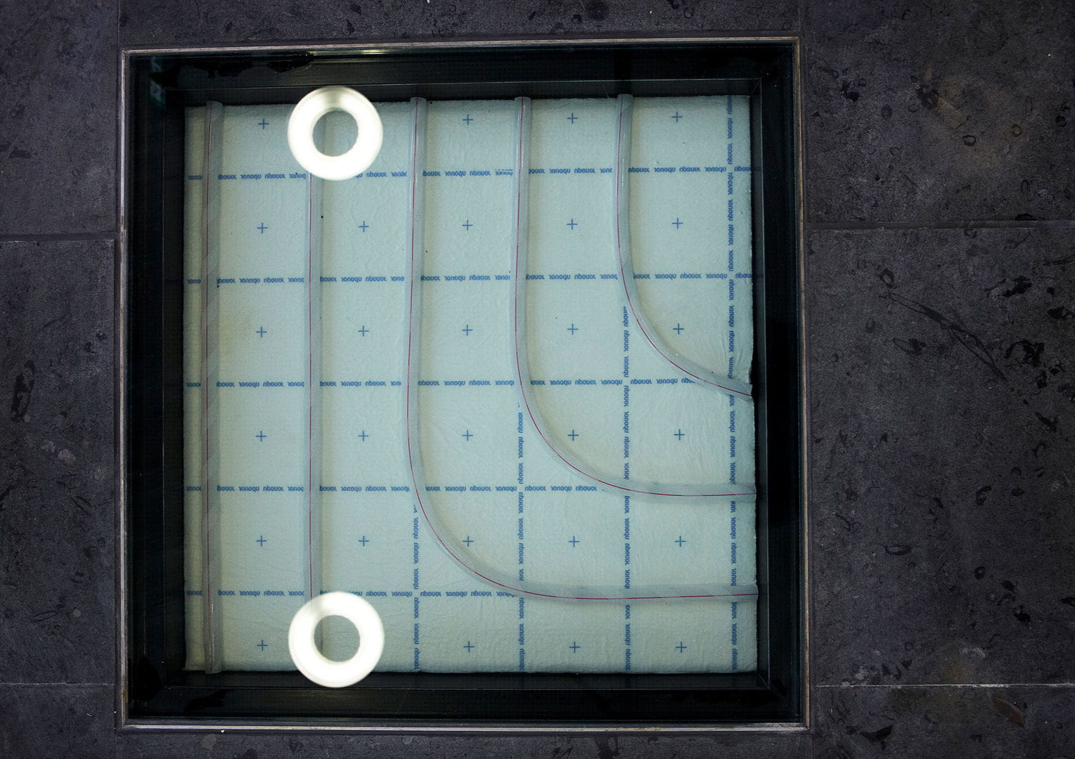 The expert fitters from Bechert Haustechnik GmbH installed a 347 m2 radiant heating system with 24 heating circuits. Uponor PE-Xa RED Klett pipes, size 16 mm x 1.8 mm, were laid 10 cm apart in the conference room and 15 cm apart in the information centre and foyer area. With a flow temperature of 39.7 °C (return 32.6 °C) the underfloor heating system covers a heat load of 41 W/m2 in the public areas.