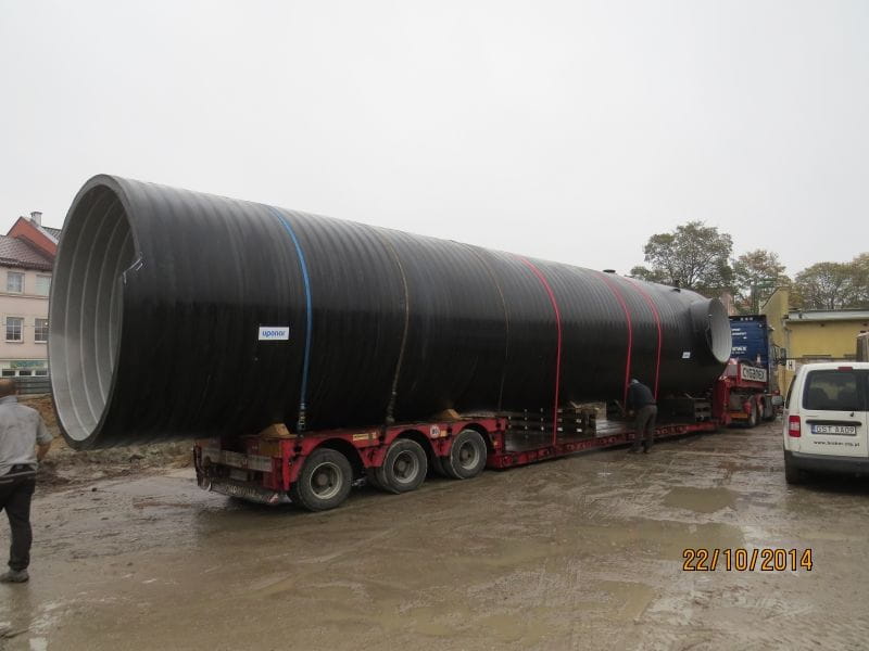 Uponor Infra delivered for this project 4 fire water tanks Weho of diameter dn3000mm, ring stiffness SN2, length of 11,15-32,84m and total capacity of 460m³. The tanks are to be used as a water reserve for the sprinkler system in the shopping mall and are filled from the municipal network. The water from the tanks is supplied to the pumping stations. The tanks are equipped with suction strainers, floating valves, liquid level sensors and emergency overflows. The individual segments of the tanks were installed under the extrusion welding method, carried out by Uponor Infra Service Group, ensuring the uniformity and tightness of the structure.