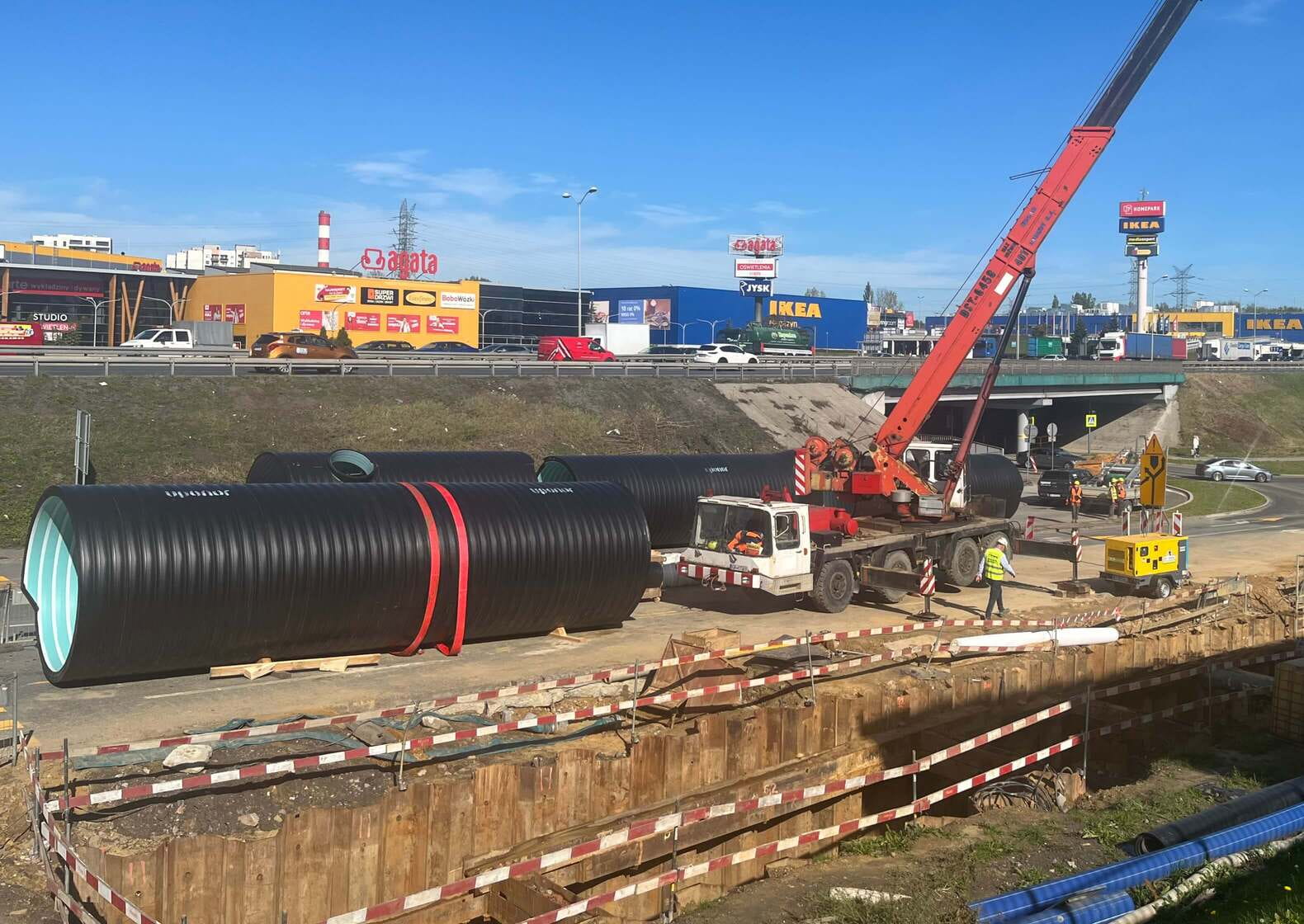 The underground PEHD SN8 DN2500 retention tank with a length of 80 meters and a capacity of over 392 m³, together with a new pumping station, is one of the key elements of the drainage system for the "Agata Junction." This is due to the high frequency of stormwater inflow in the area of the road crossing located in a depression beneath the overpass. Once the new drainage system is operational, stormwater — rather than accumulating on the road, forming puddles, and causing traffic paralysis — will flow directly into the tank, which will be emptied continuously.